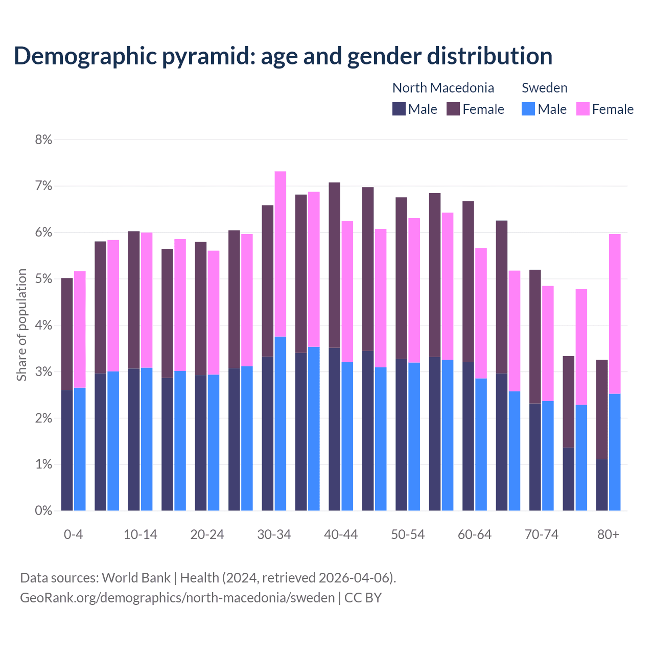 - North Macedonia is ranked 37/196 by median age (oldest to youngest) vs 39/196 for Sweden.