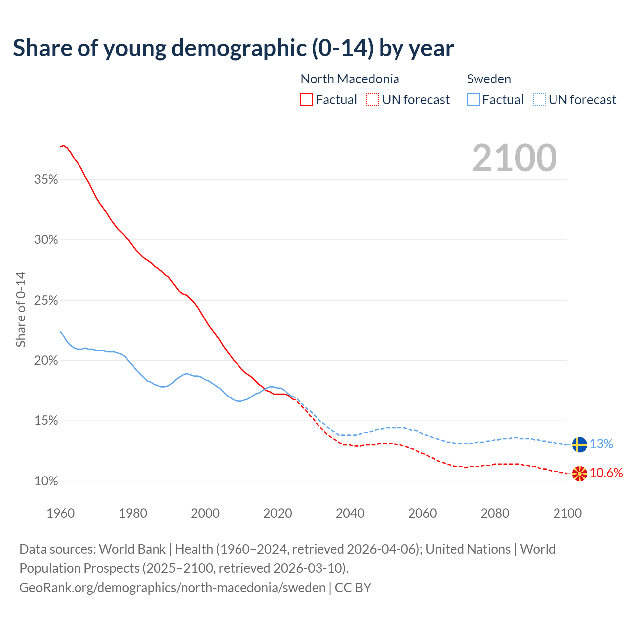 - The share of young demographic (0-15 years old) in North Macedonia is 16.8% vs 17% in Sweden.