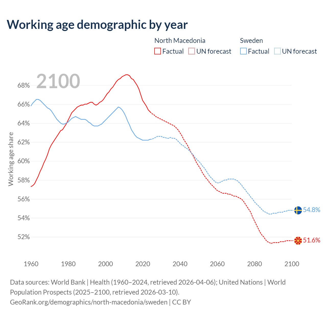 Median age North Macedonia vs Sweden, 1960-2100