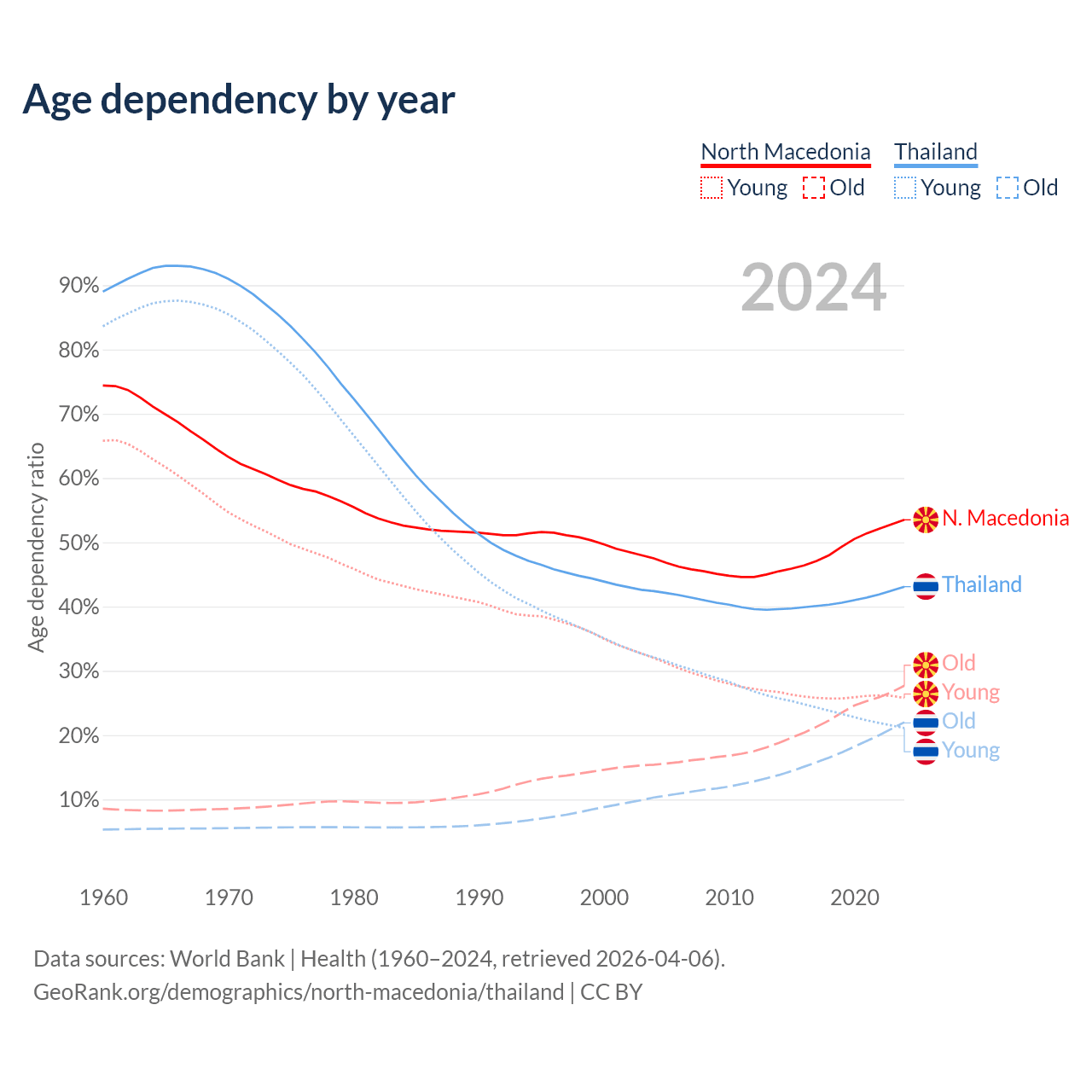 - North Macedonia is ranked 37/196 by median age (oldest to youngest) vs 40/196 for Thailand.