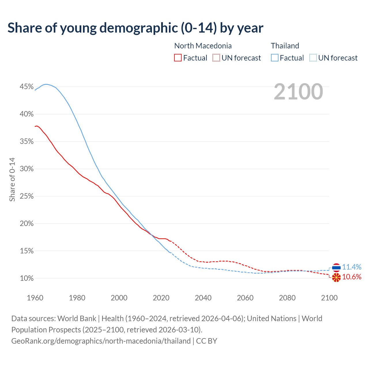 - The share of young demographic (0-15 years old) in North Macedonia is 16.8% vs 14.7% in Thailand.