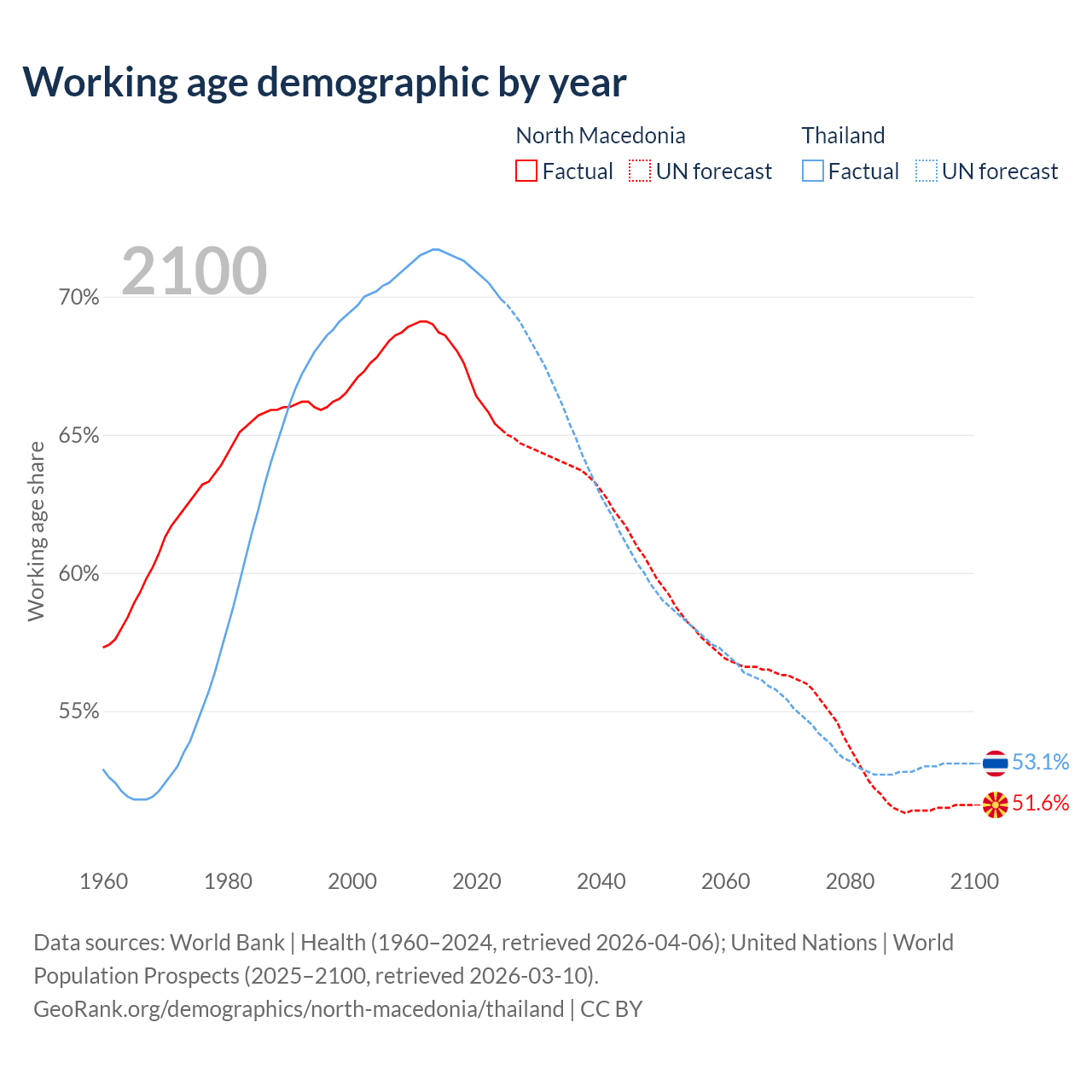 The share of older people aged 65 and over is 18% in North Macedonia and 15.4% in Thailand. Life expectancy in North Macedonia compared to Thailand .