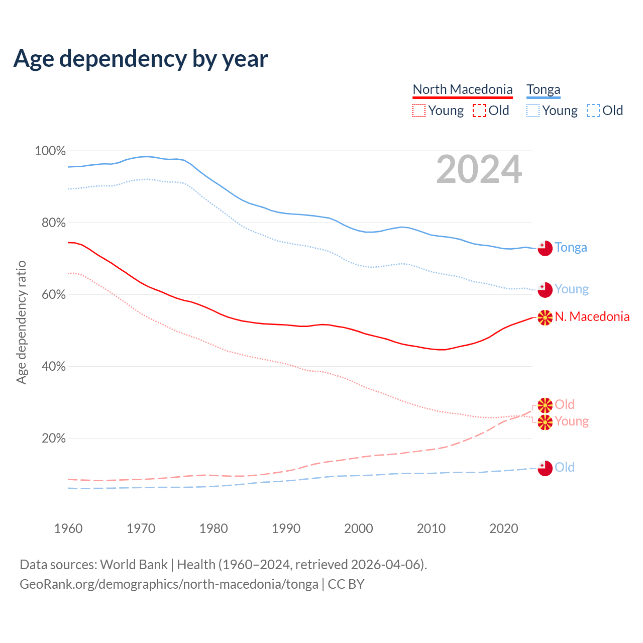 - The share of old-age demographic (65+) in North Macedonia is 18% vs 6.72% in Tonga.