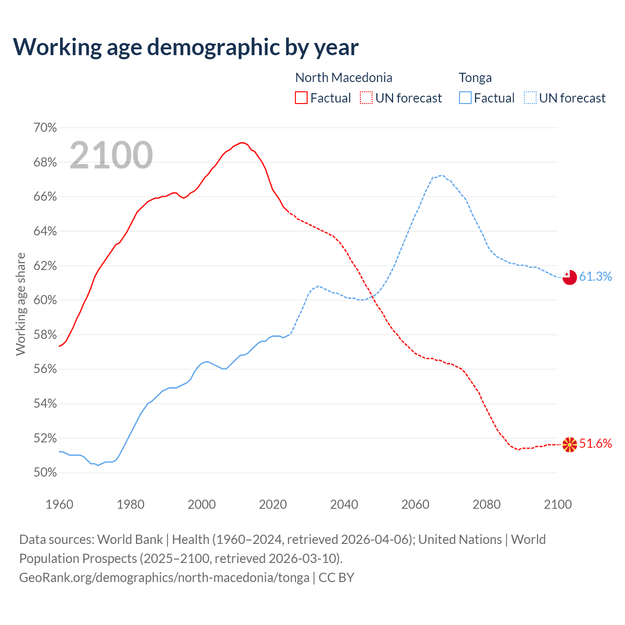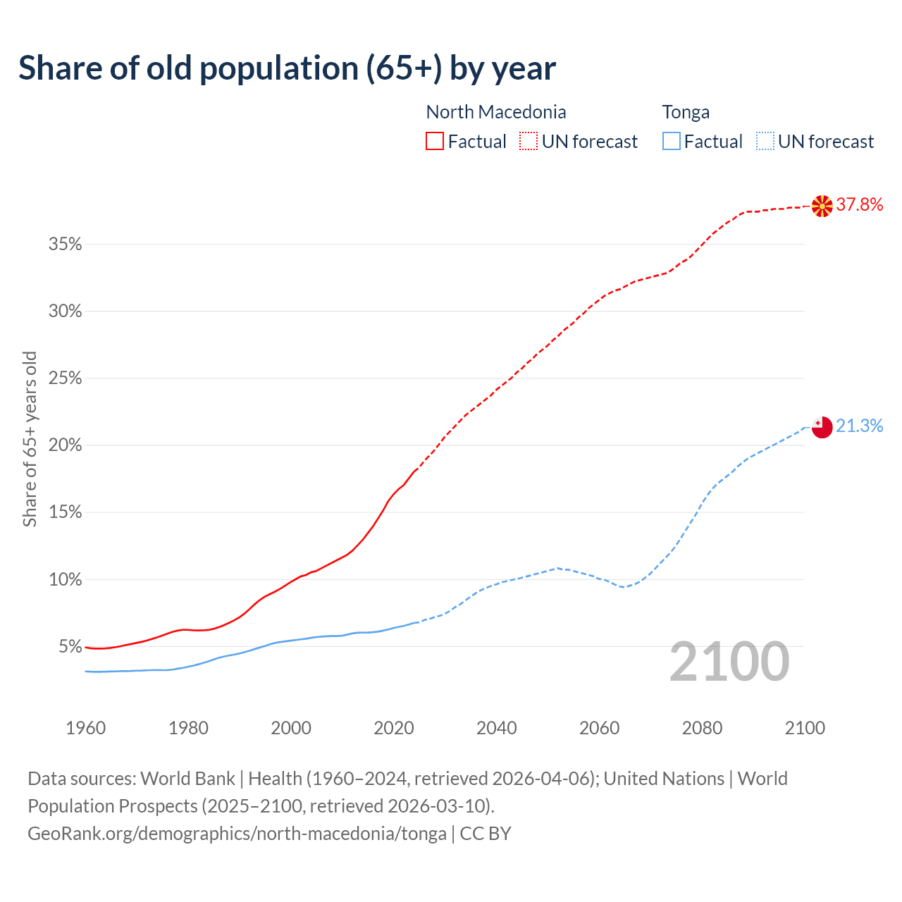 The share of older people aged 65 and over is 18% in North Macedonia and 6.72% in Tonga. Life expectancy in North Macedonia compared to Tonga .