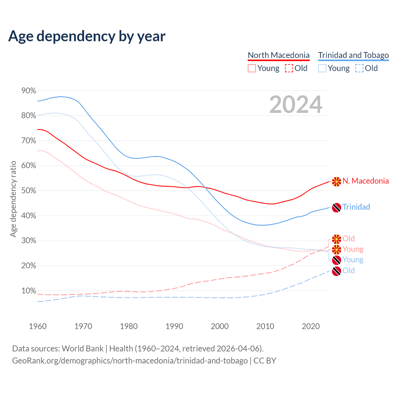 - The share of old-age demographic (65+) in North Macedonia is 18% vs 12.4% in Trinidad and Tobago.