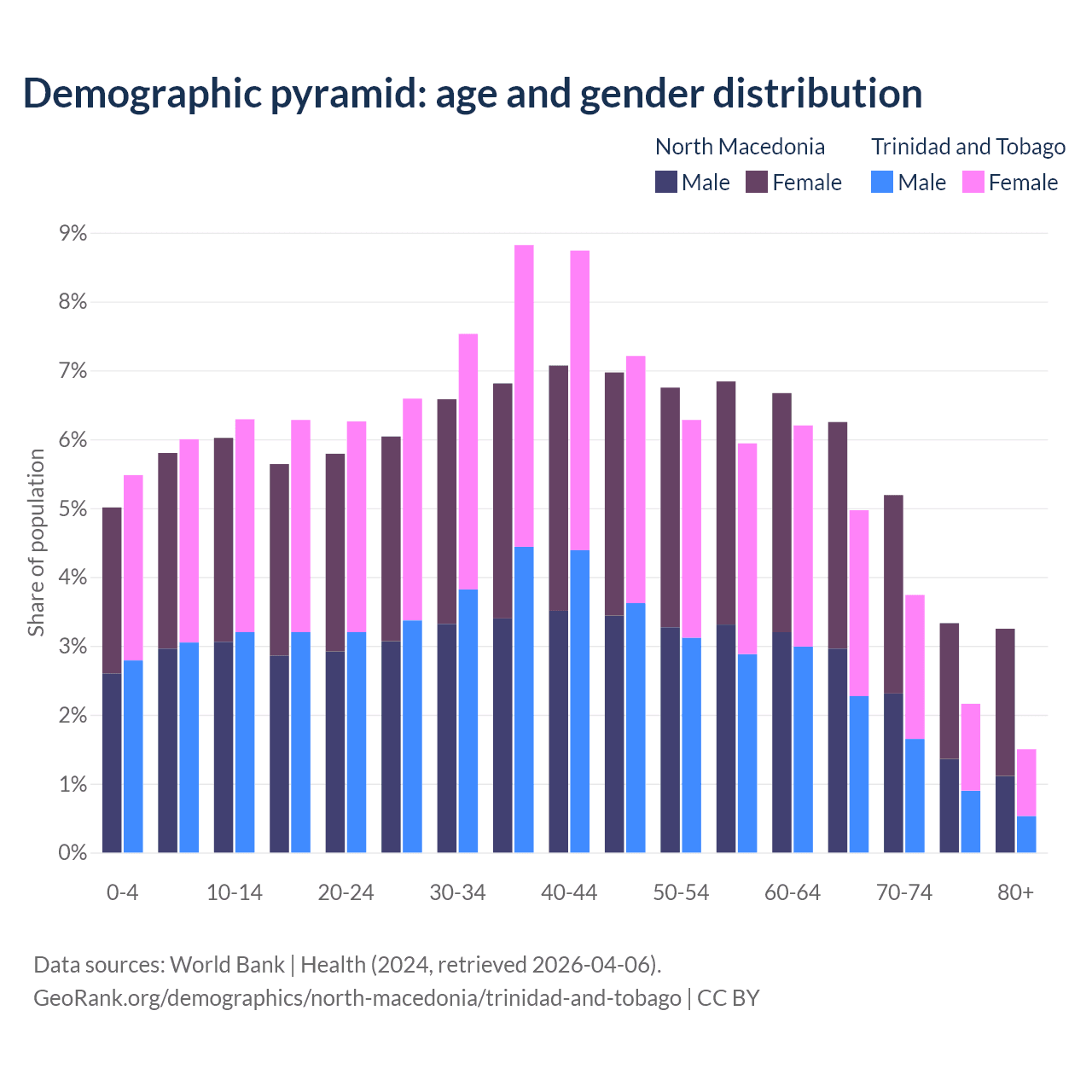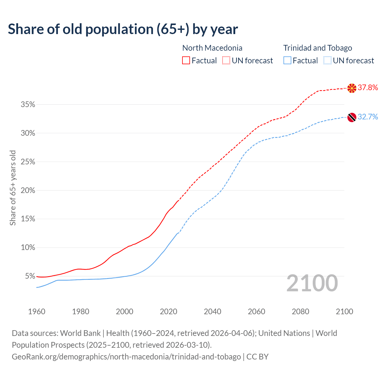 The share of older people aged 65 and over is 18% in North Macedonia and 12.4% in Trinidad and Tobago. Life expectancy in North Macedonia compared to Trinidad and Tobago .