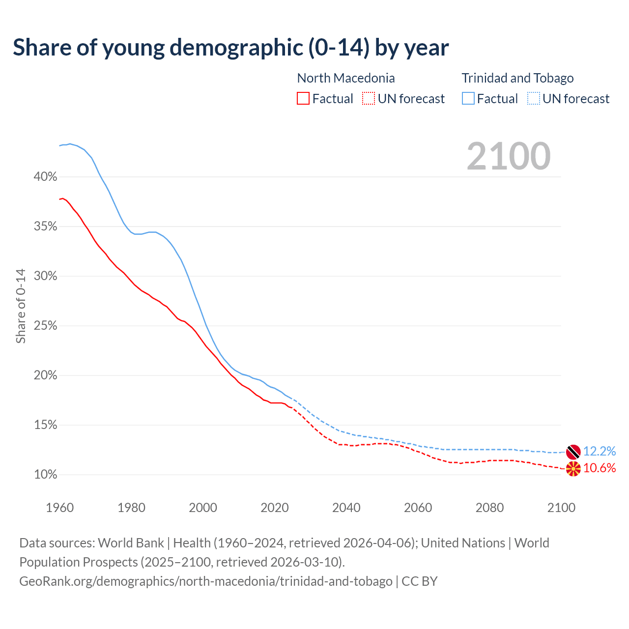 - The share of young demographic (0-15 years old) in North Macedonia is 16.8% vs 17.8% in Trinidad and Tobago.