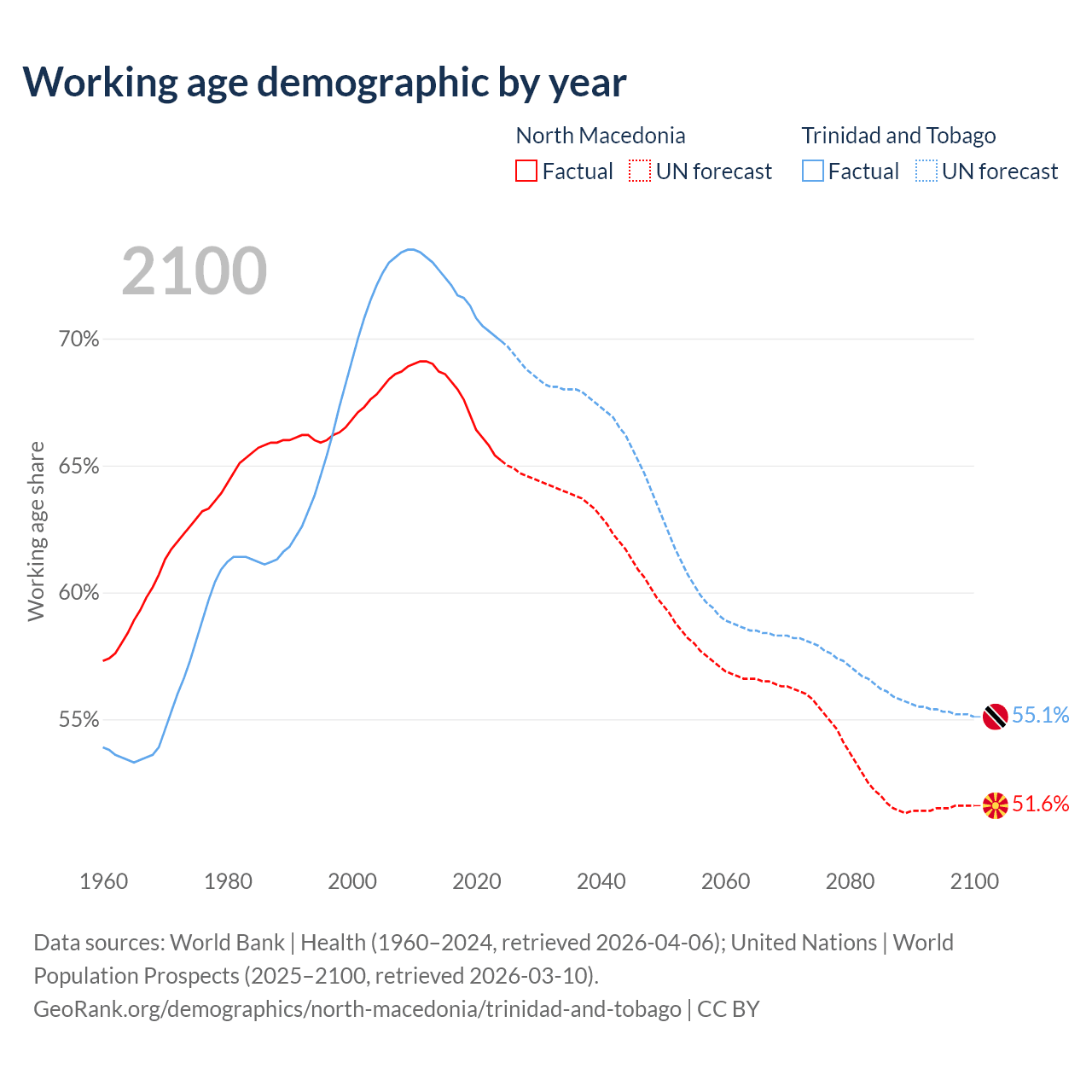 Median age North Macedonia vs Trinidad and Tobago, 1960-2100