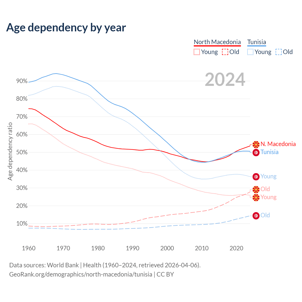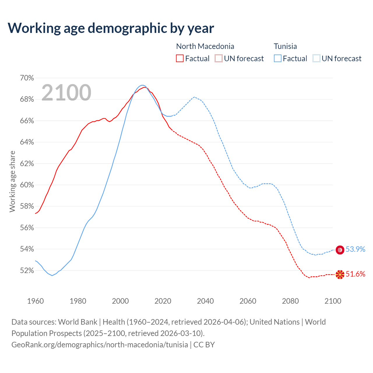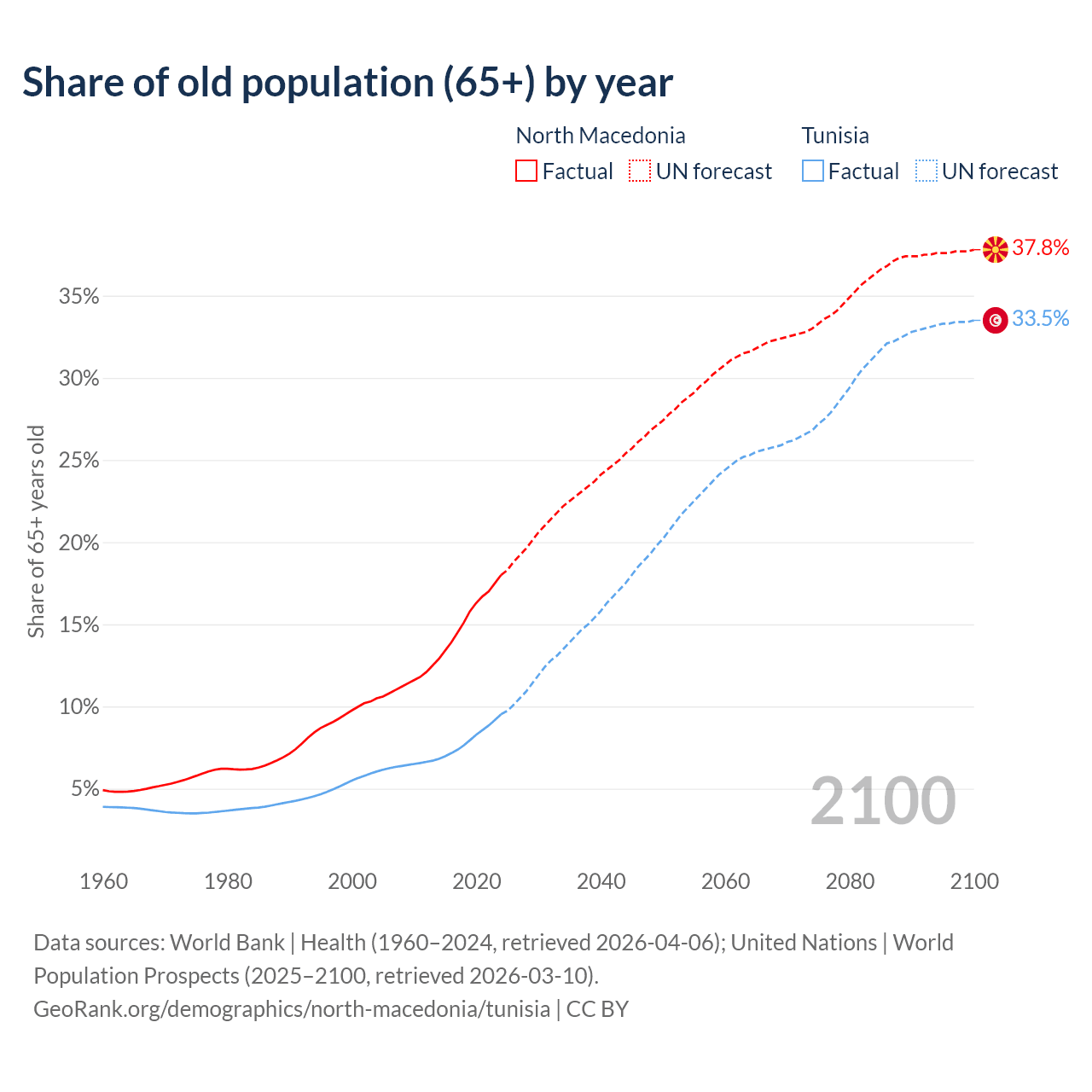 The share of older people aged 65 and over is 18% in North Macedonia and 9.53% in Tunisia. Life expectancy in North Macedonia compared to Tunisia .