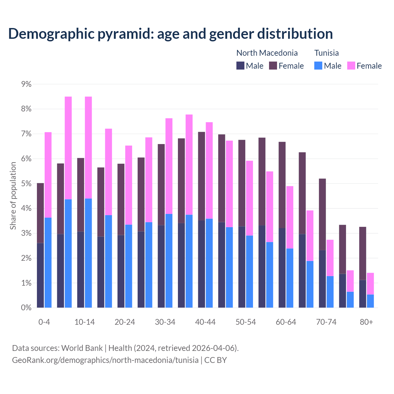 - North Macedonia is ranked 37/196 by median age (oldest to youngest) vs 86/196 for Tunisia.