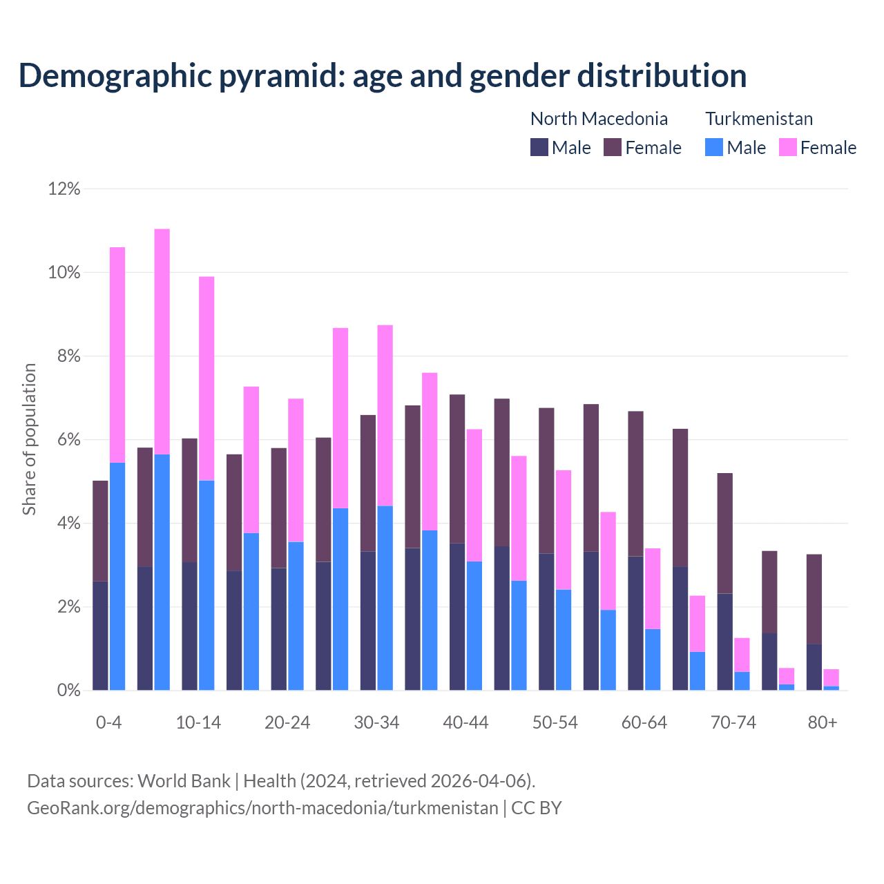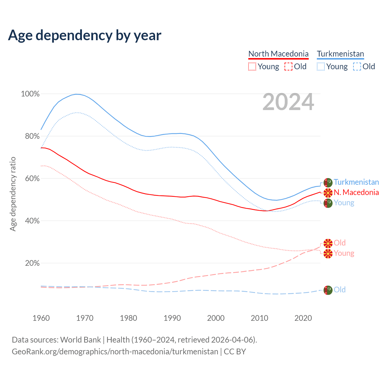 - North Macedonia is ranked 37/196 by median age (oldest to youngest) vs 119/196 for Turkmenistan.