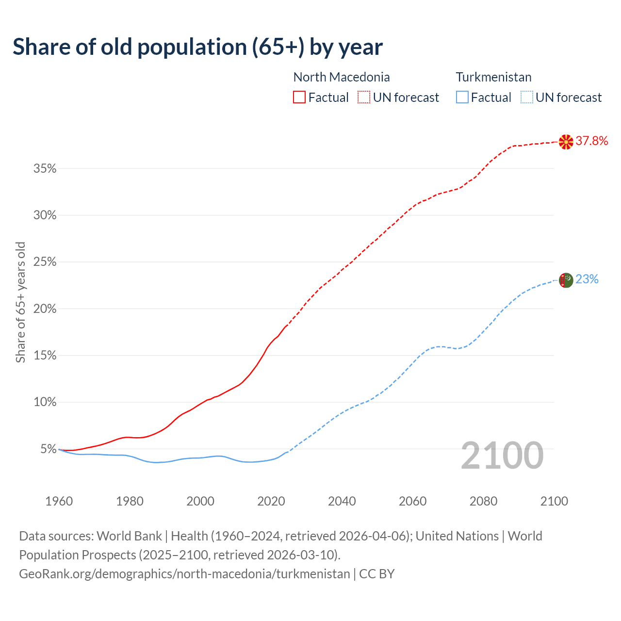 The share of older people aged 65 and over is 18% in North Macedonia and 4.53% in Turkmenistan. Life expectancy in North Macedonia compared to Turkmenistan .