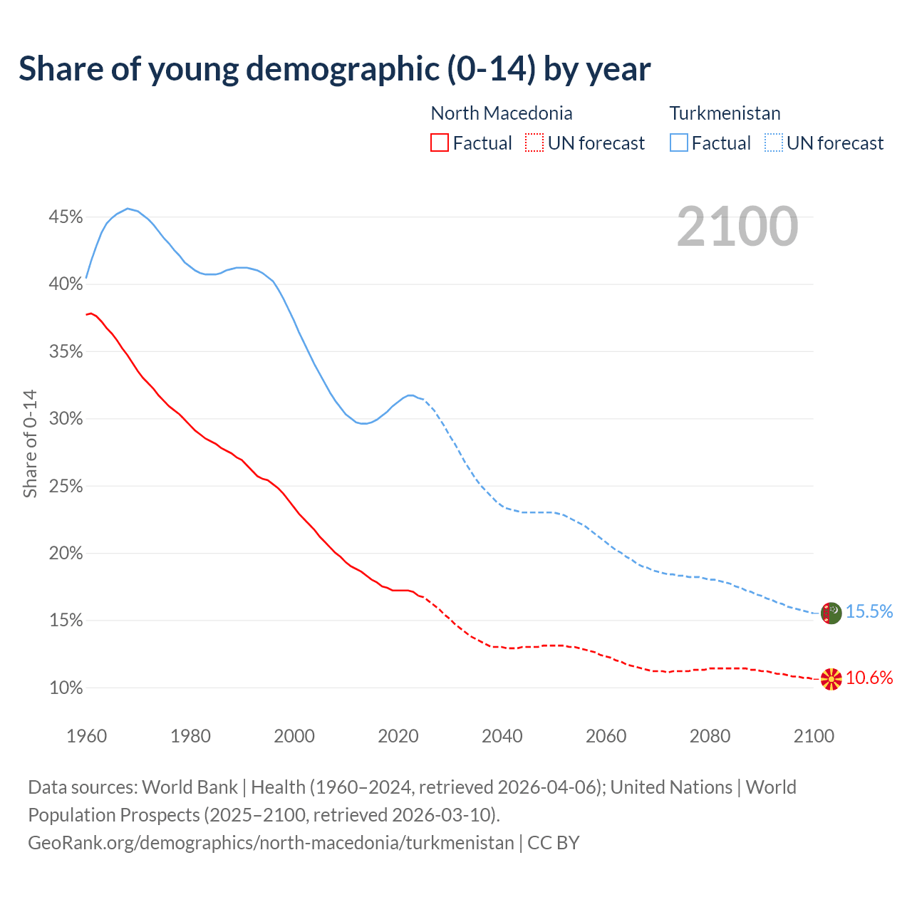 - The share of young demographic (0-15 years old) in North Macedonia is 16.8% vs 31.5% in Turkmenistan.