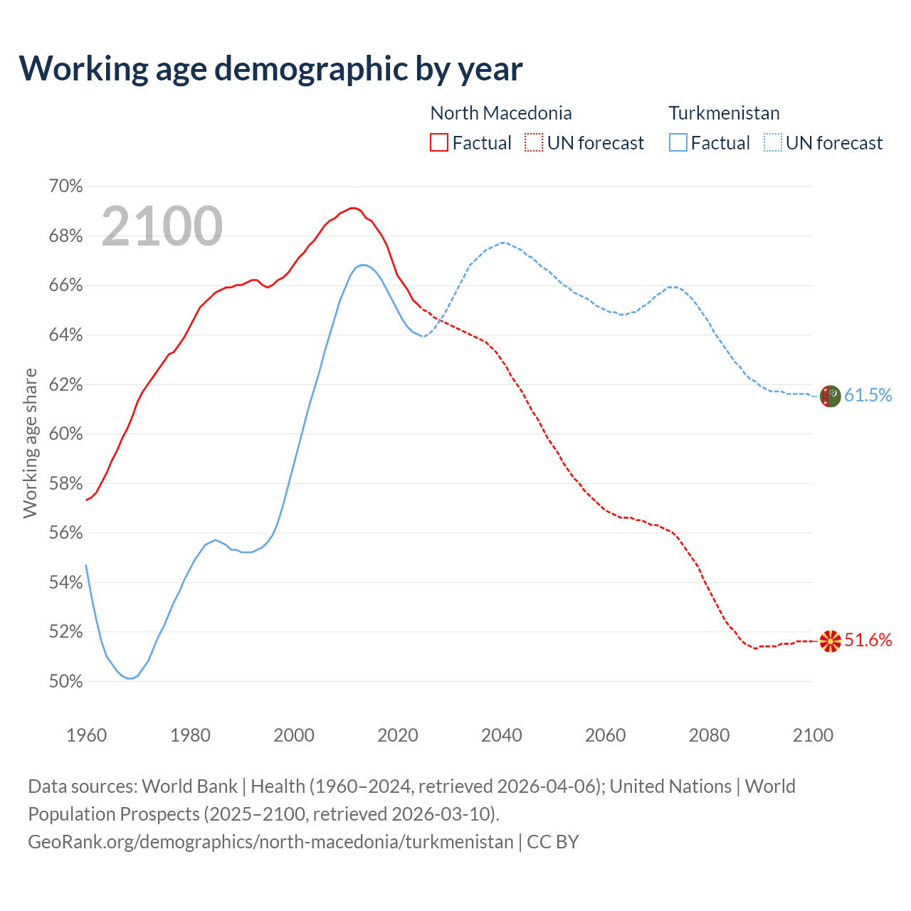 - North Macedonia has 1.18M working age adults (aged 15-64) vs 4.97M in Turkmenistan.