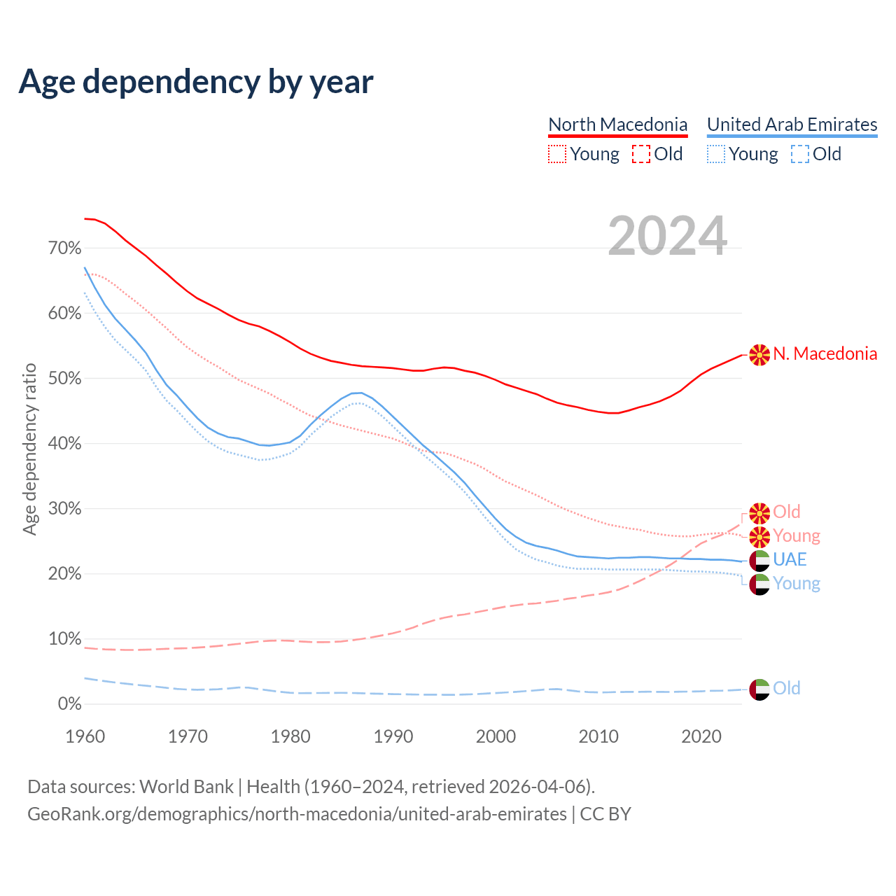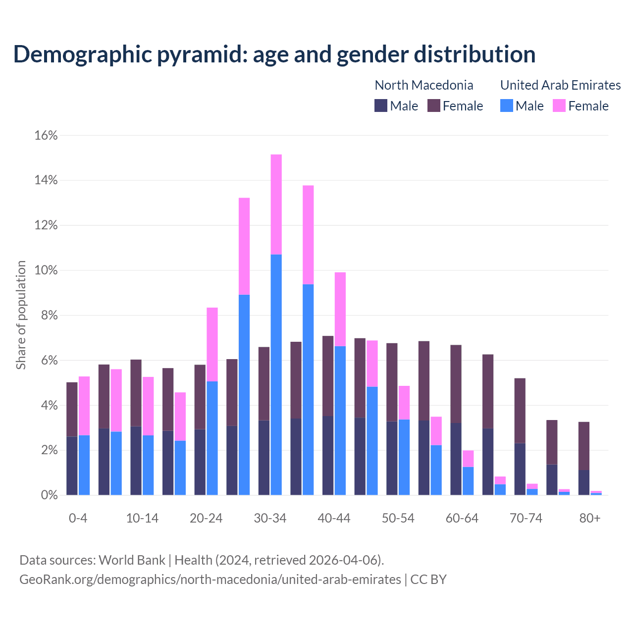 - North Macedonia is ranked 37/196 by median age (oldest to youngest) vs 91/196 for the United Arab Emirates.