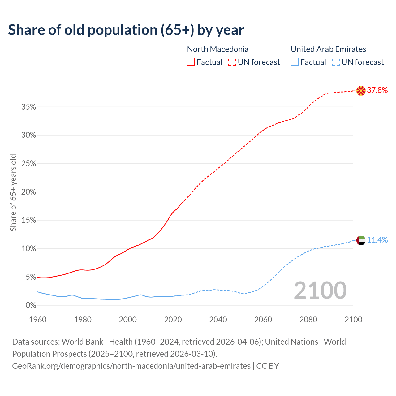- The share of old-age demographic (65+) in North Macedonia is 18% vs 1.77% in the United Arab Emirates.