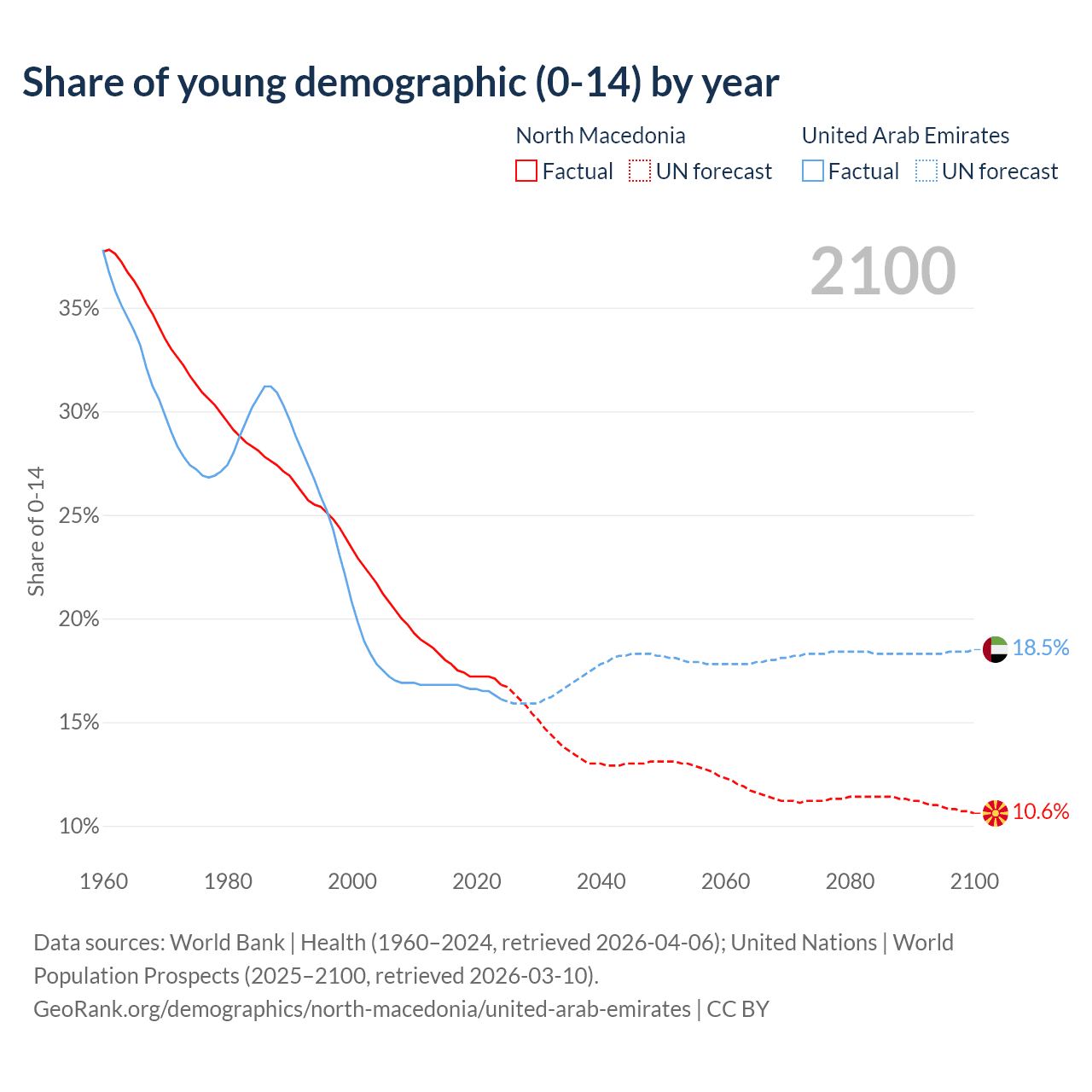 - The share of young demographic (0-15 years old) in North Macedonia is 16.8% vs 16.1% in the United Arab Emirates.