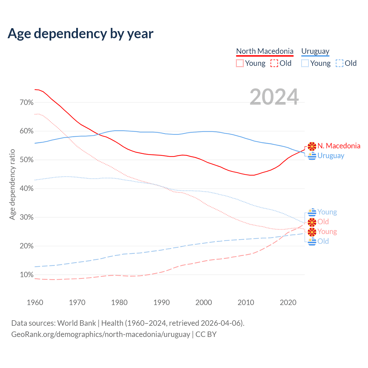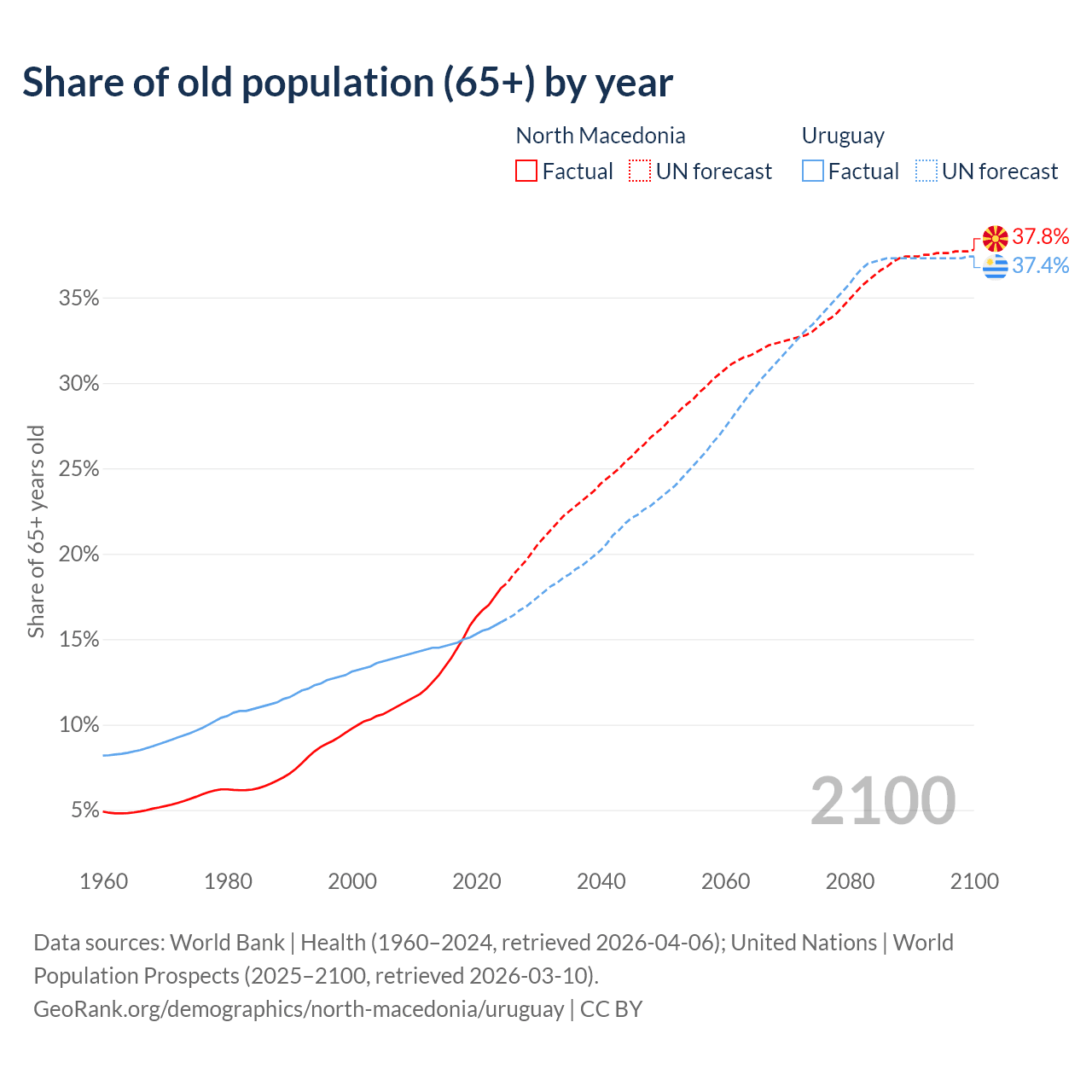 The share of older people aged 65 and over is 18% in North Macedonia and 16% in Uruguay. Life expectancy in North Macedonia compared to Uruguay .