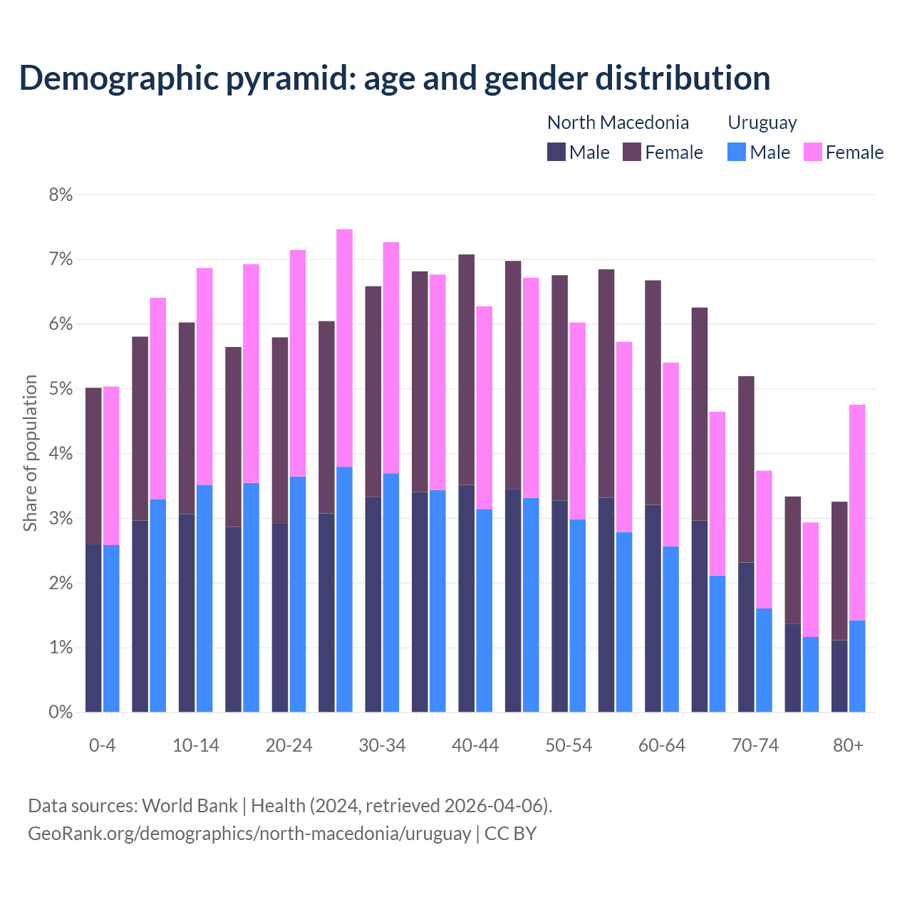 - North Macedonia is ranked 37/196 by median age (oldest to youngest) vs 63/196 for Uruguay.