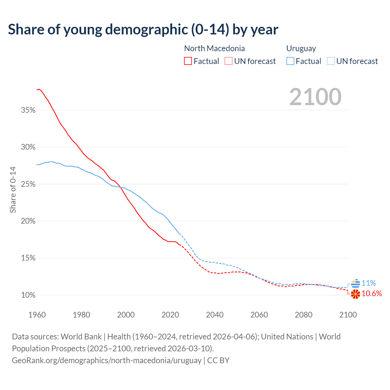 - The share of young demographic (0-15 years old) in North Macedonia is 16.8% vs 18.3% in Uruguay.