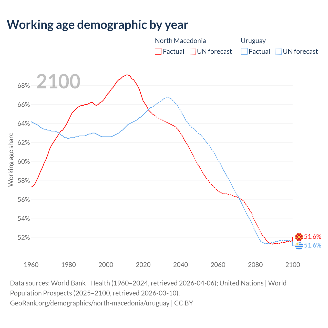Median age North Macedonia vs Uruguay, 1960-2100