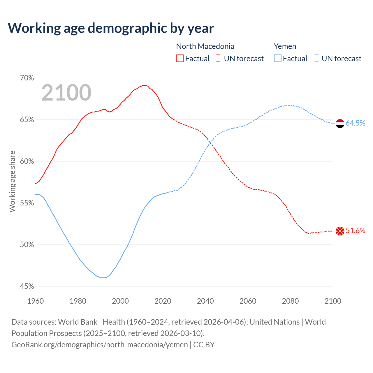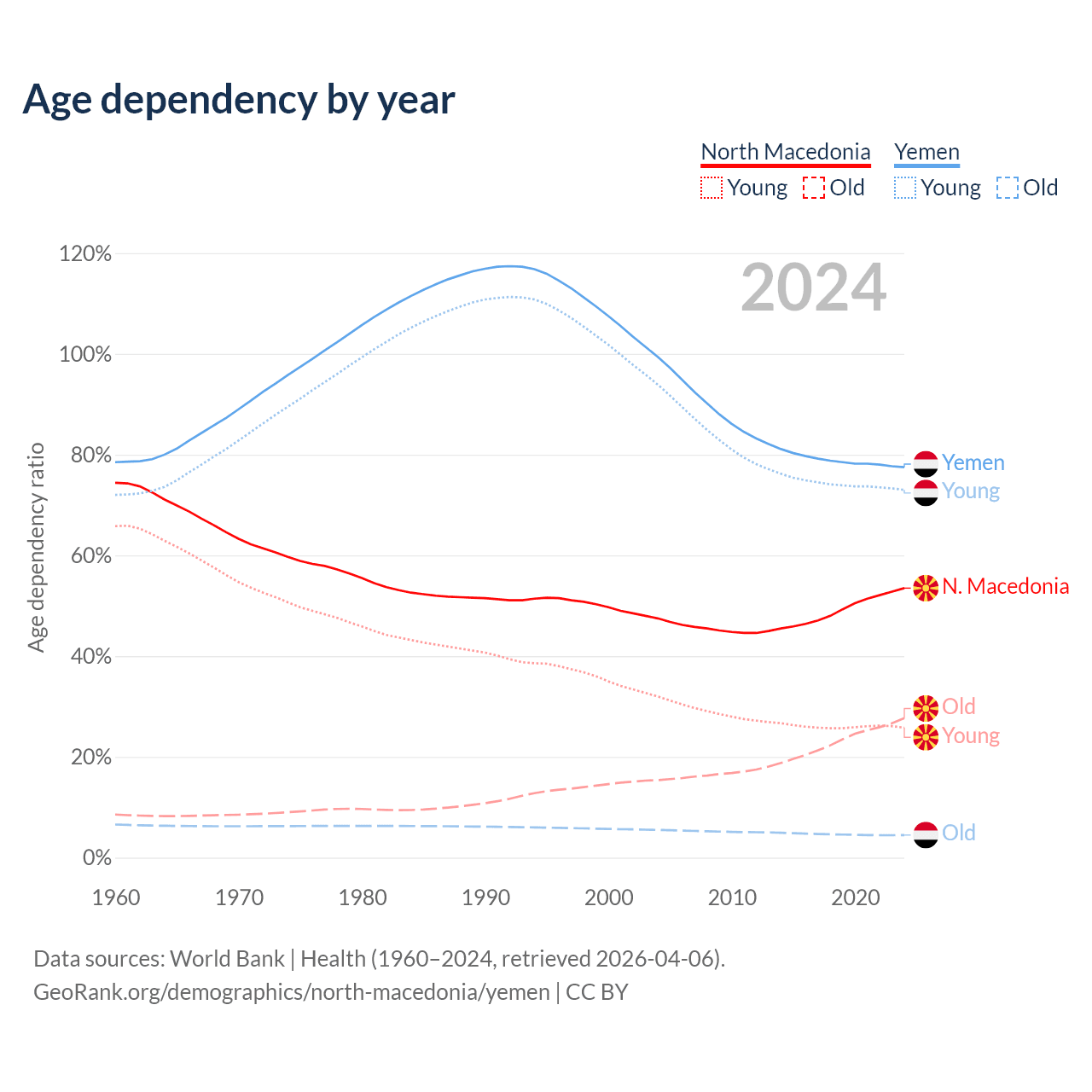 The share of older people aged 65 and over is 18% in North Macedonia and 2.52% in Yemen. Life expectancy in North Macedonia compared to Yemen .