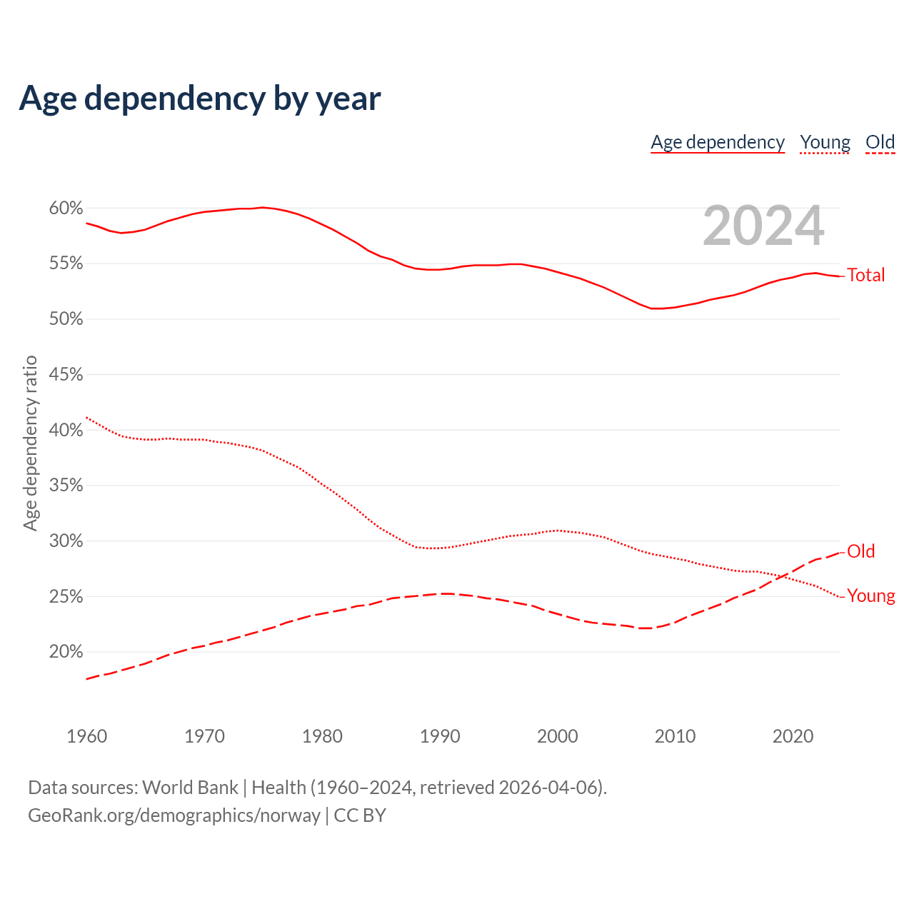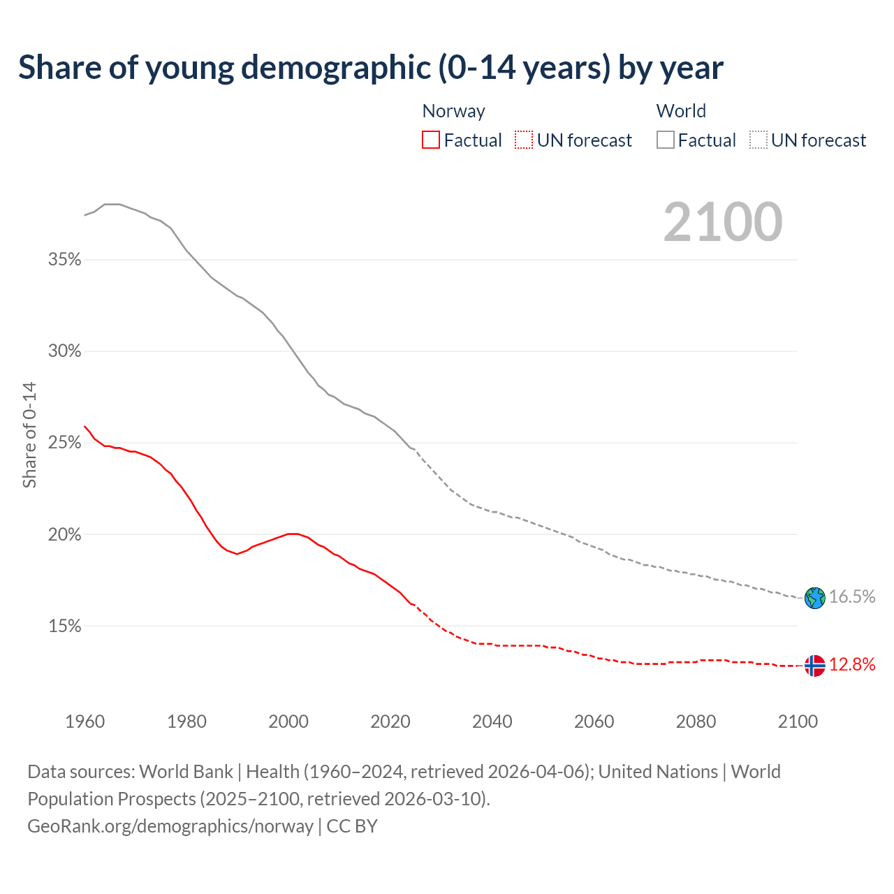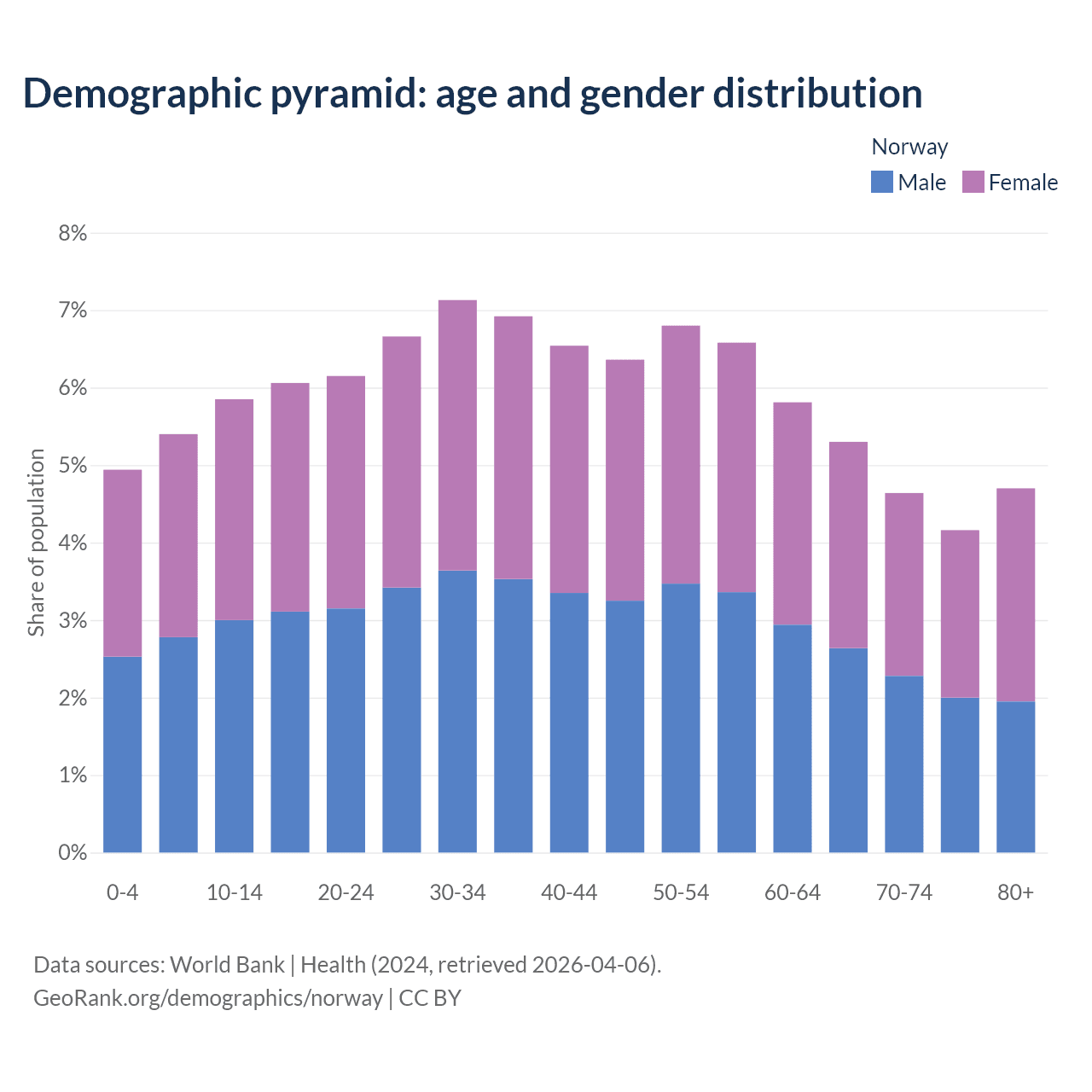 With a population of 5.57M people, Norway has a median age of 40.7 years which makes it the 43/196 oldest country. 16.2% of the demographic are children 0-14 years old, 65% are working-age people aged 15-64, and 18.8% are older population aged 65+ years.