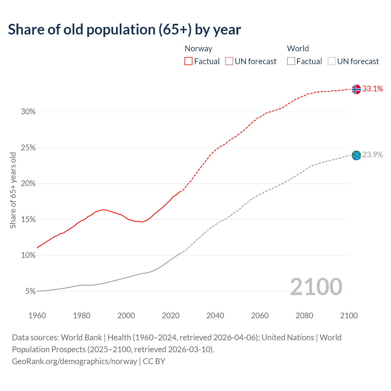 The share of older people aged 65 and over in Norway increased from 14.7% to 18.8% between 2004 and 2024.