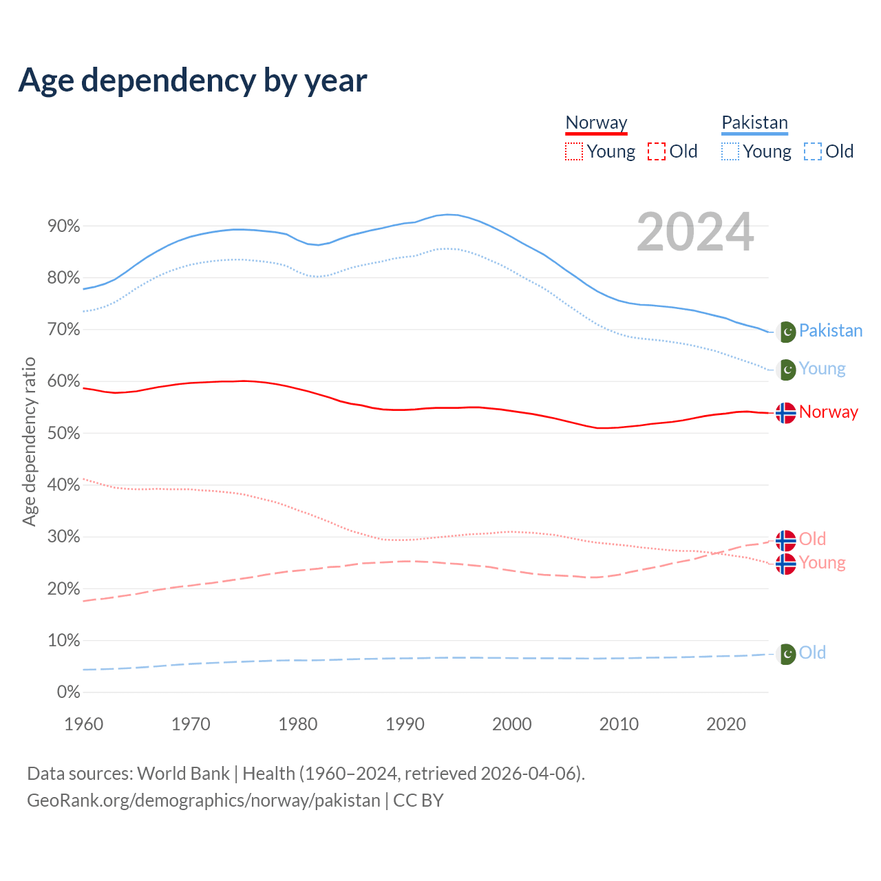 - The share of old-age demographic (65+) in Norway is 18.8% vs 4.28% in Pakistan.