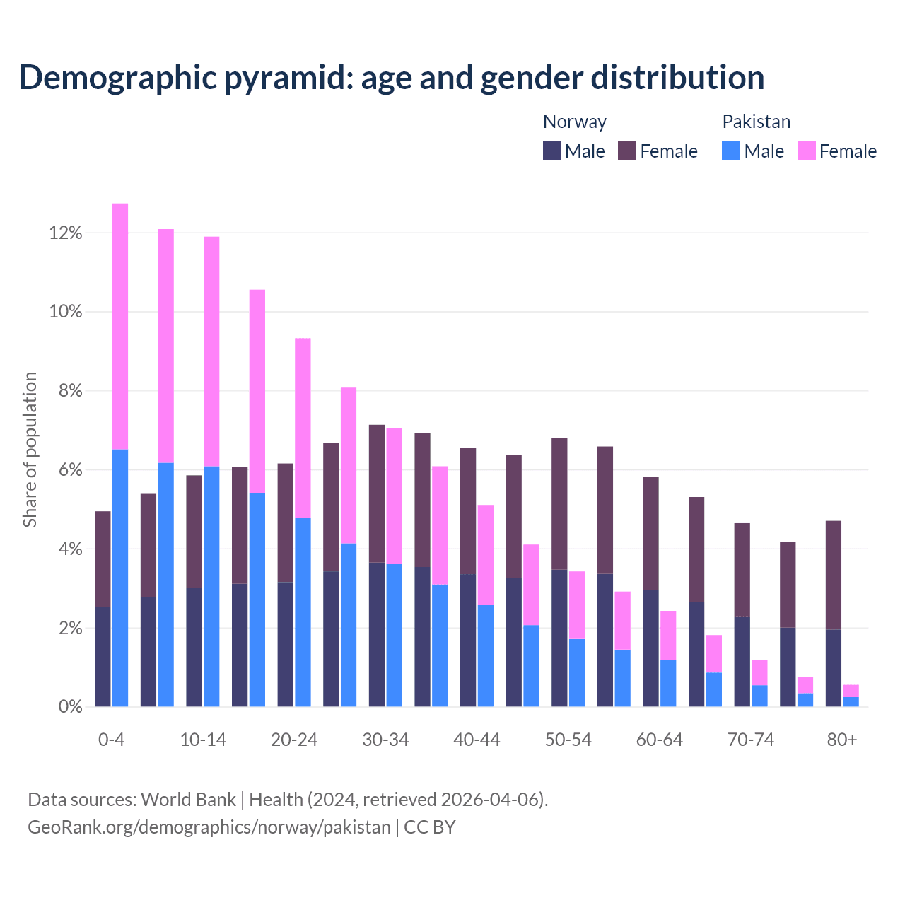 - Norway is ranked 43/196 by median age (oldest to youngest) vs 154/196 for Pakistan.