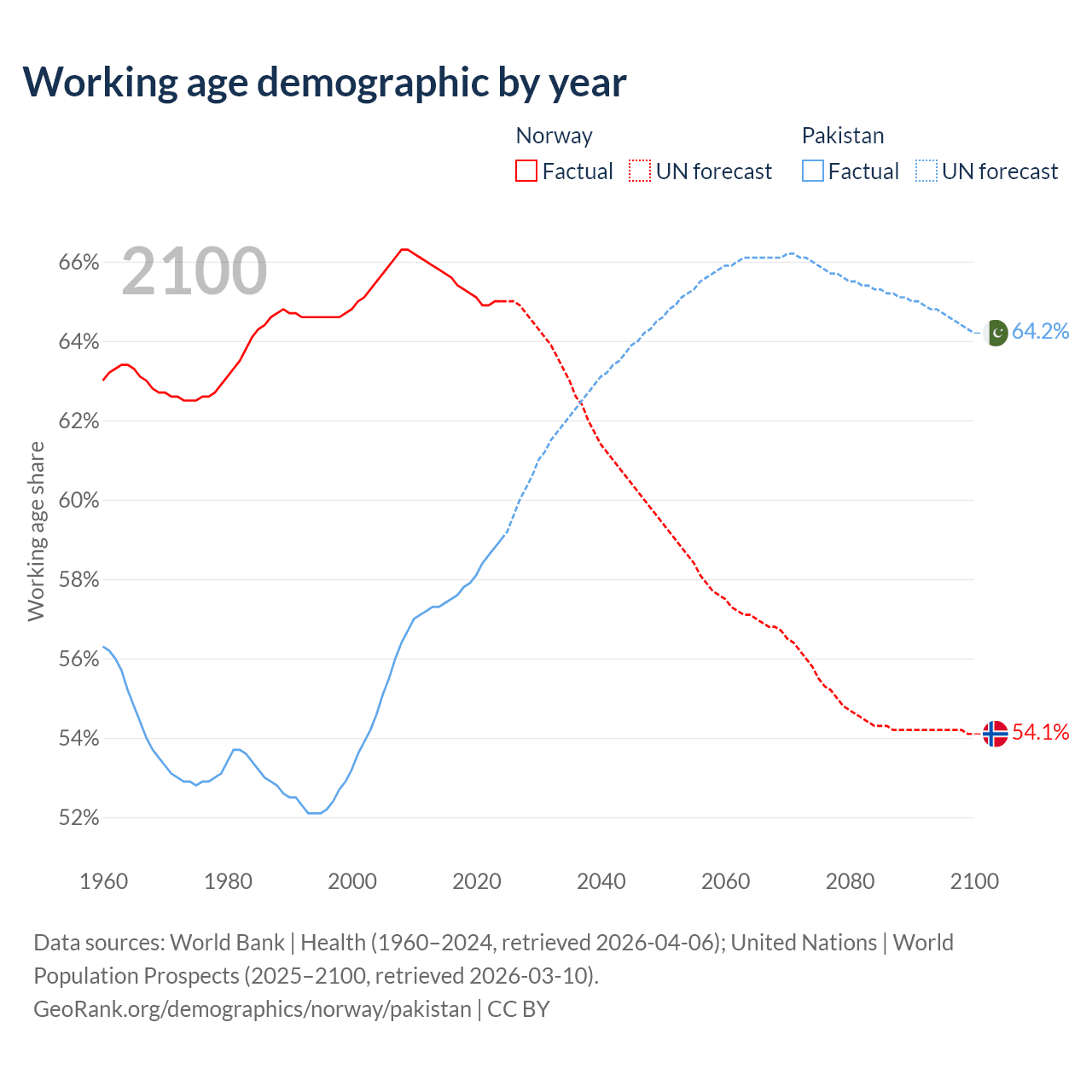 - Norway has 3.69M working age adults (aged 15-64) vs 154M in Pakistan.