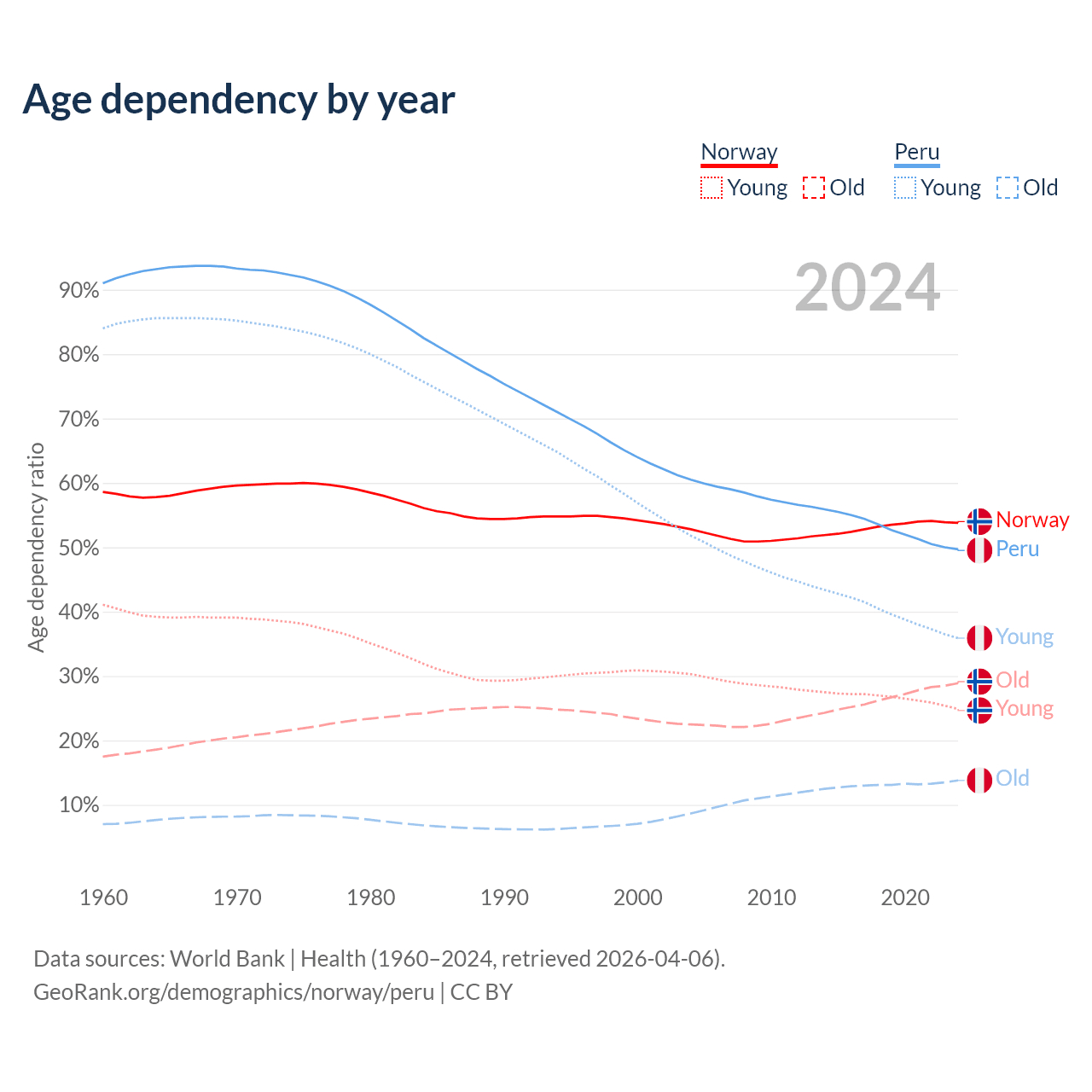- Norway is ranked 43/196 by median age (oldest to youngest) vs 97/196 for Peru.