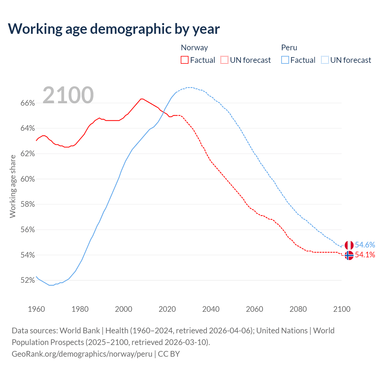 Median age Norway vs Peru, 1960-2100