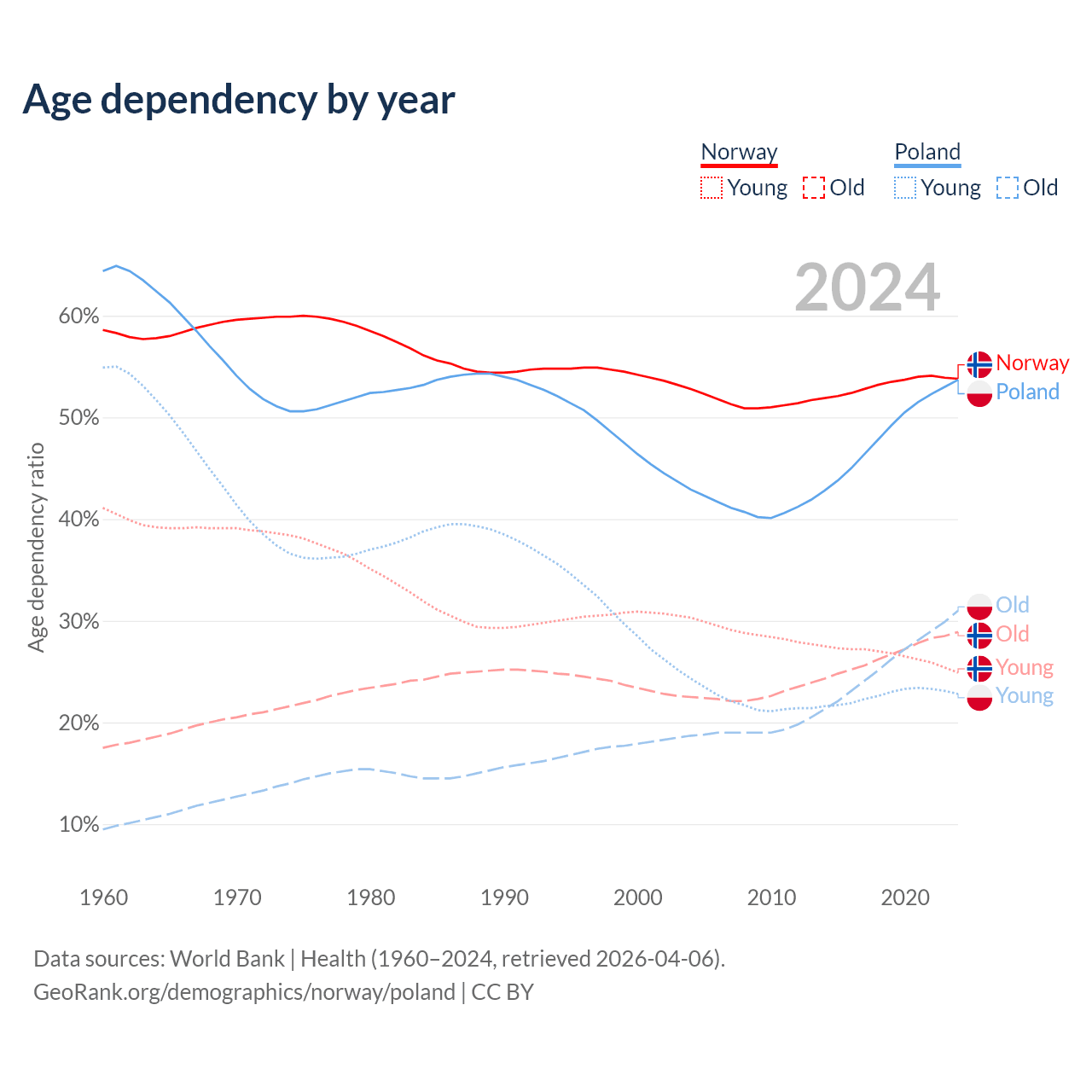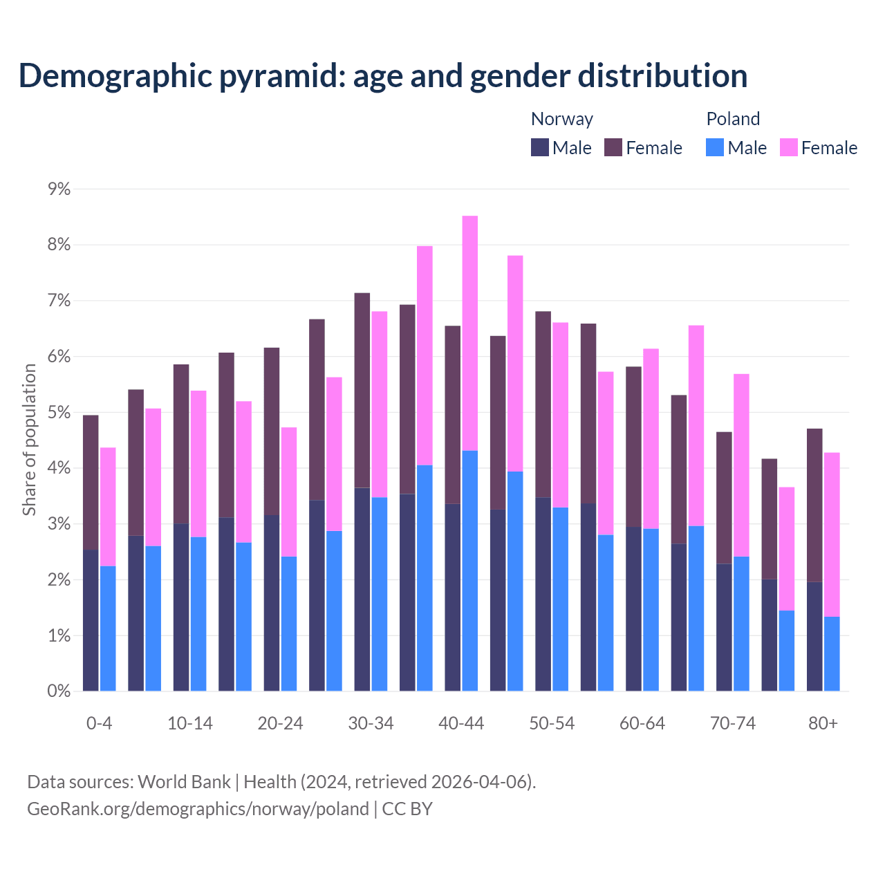 - Norway is ranked 43/196 by median age (oldest to youngest) vs 30/196 for Poland.