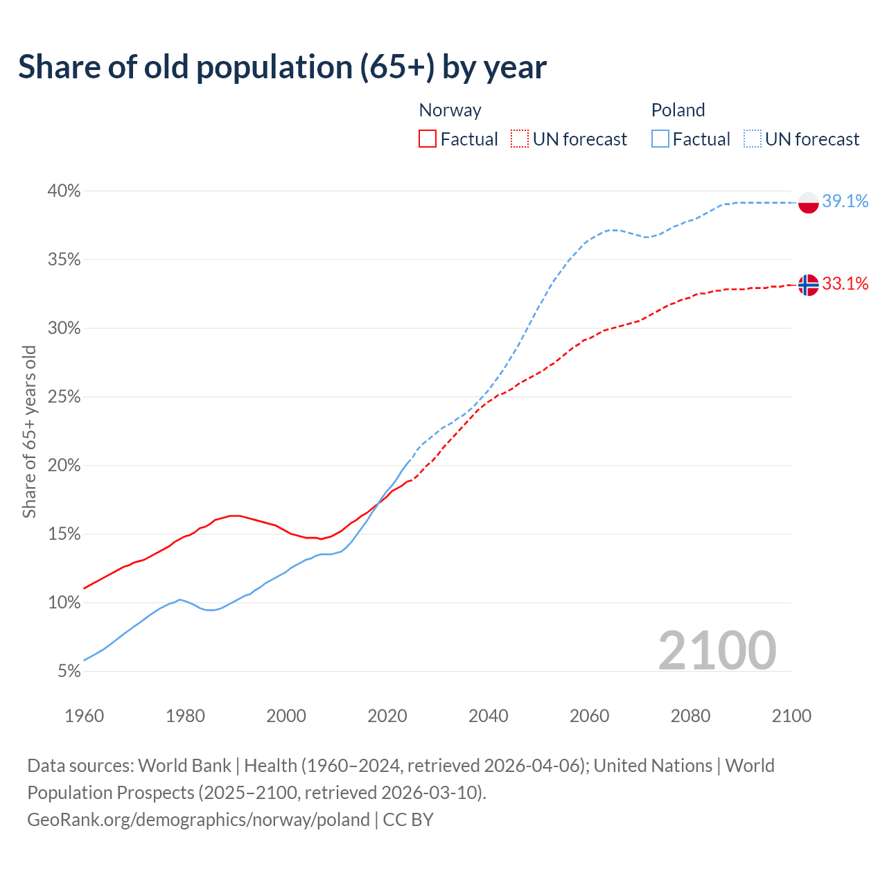 The share of older people aged 65 and over is 18.8% in Norway and 20.1% in Poland. Life expectancy in Norway compared to Poland .