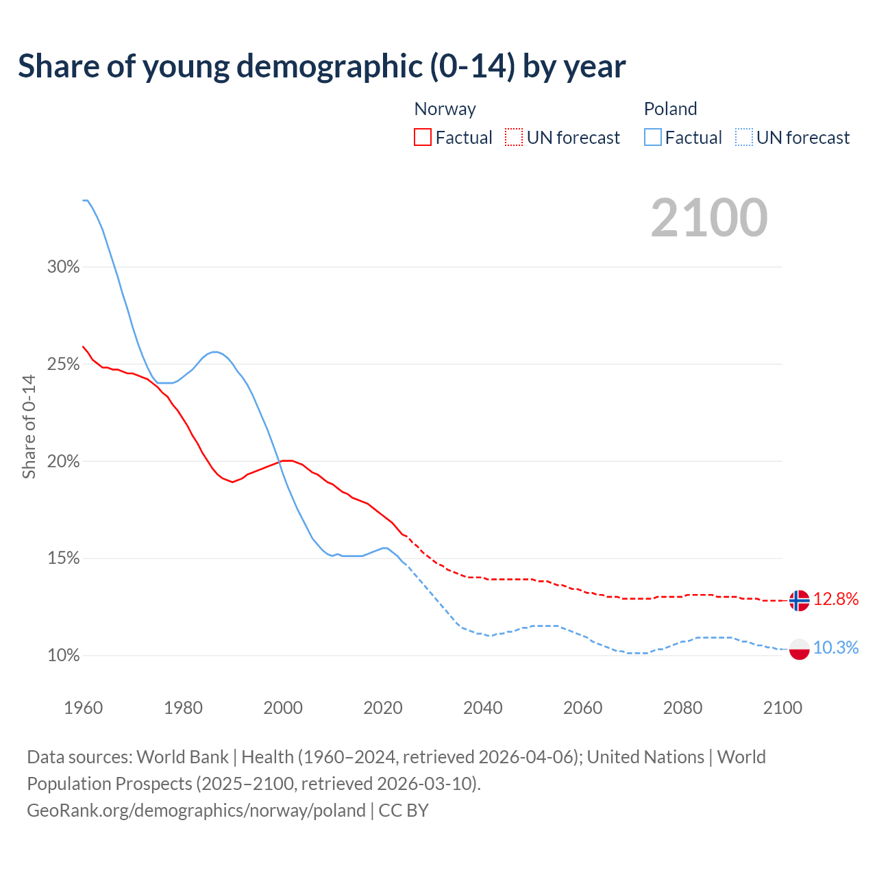- The share of young demographic (0-15 years old) in Norway is 16.2% vs 14.8% in Poland.