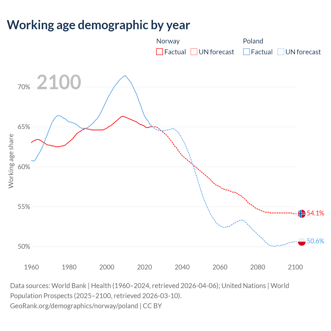 - Norway has 3.69M working age adults (aged 15-64) vs 23.3M in Poland.