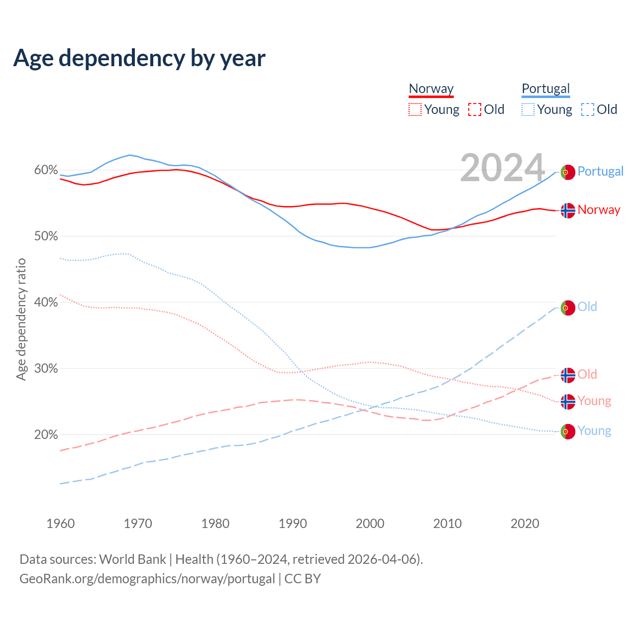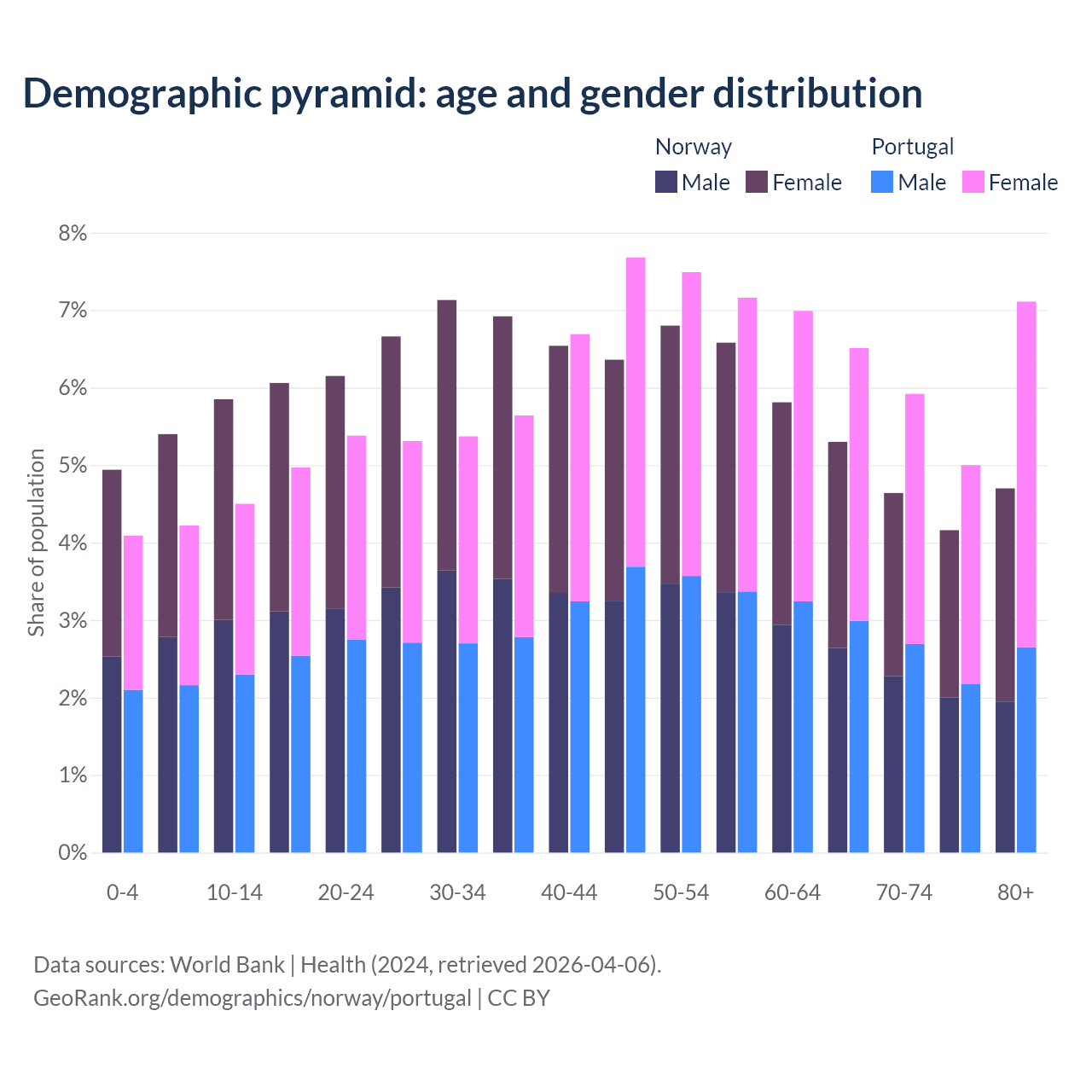 - Norway is ranked 43/196 by median age (oldest to youngest) vs 5/196 for Portugal.