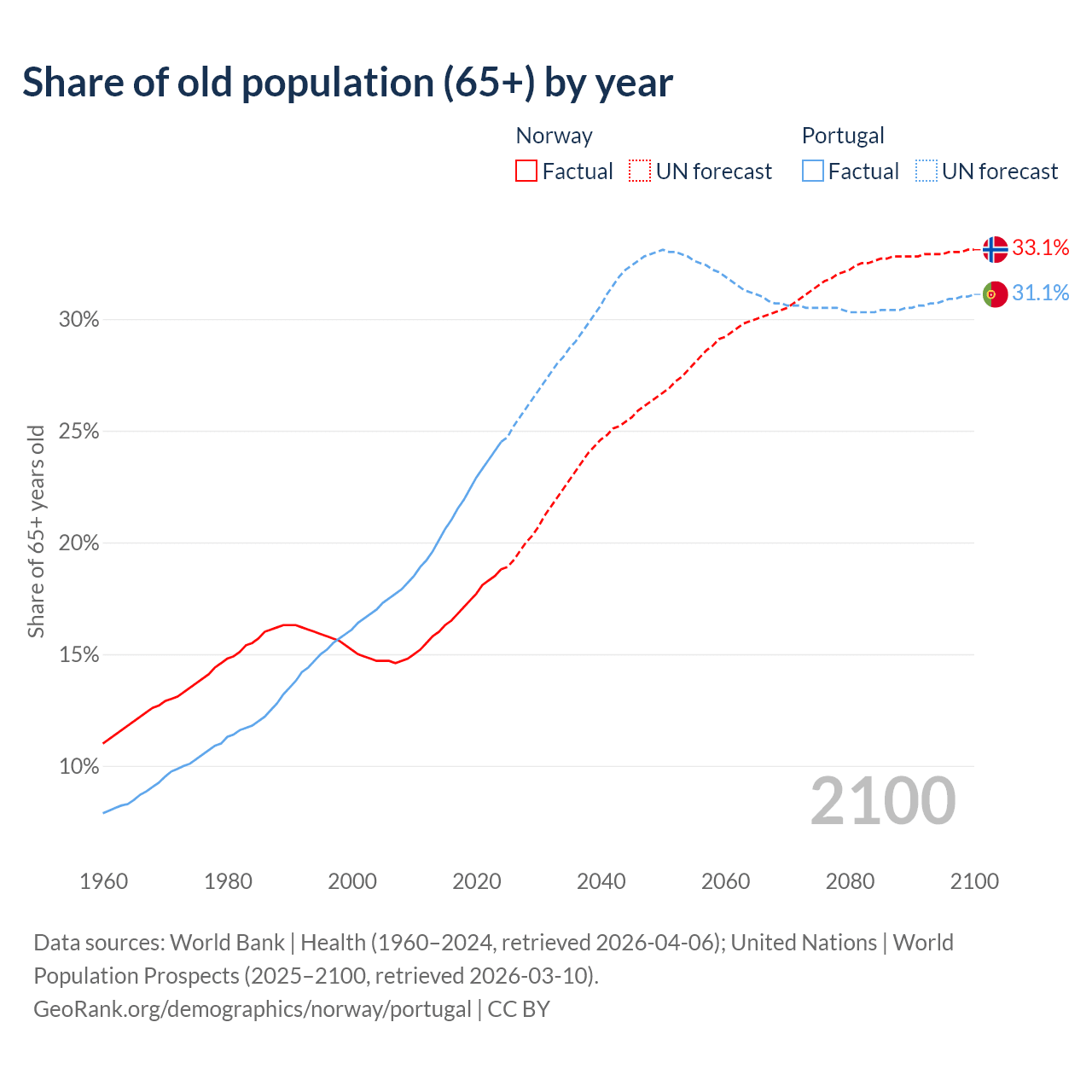 The share of older people aged 65 and over is 18.8% in Norway and 24.5% in Portugal. Life expectancy in Norway compared to Portugal .