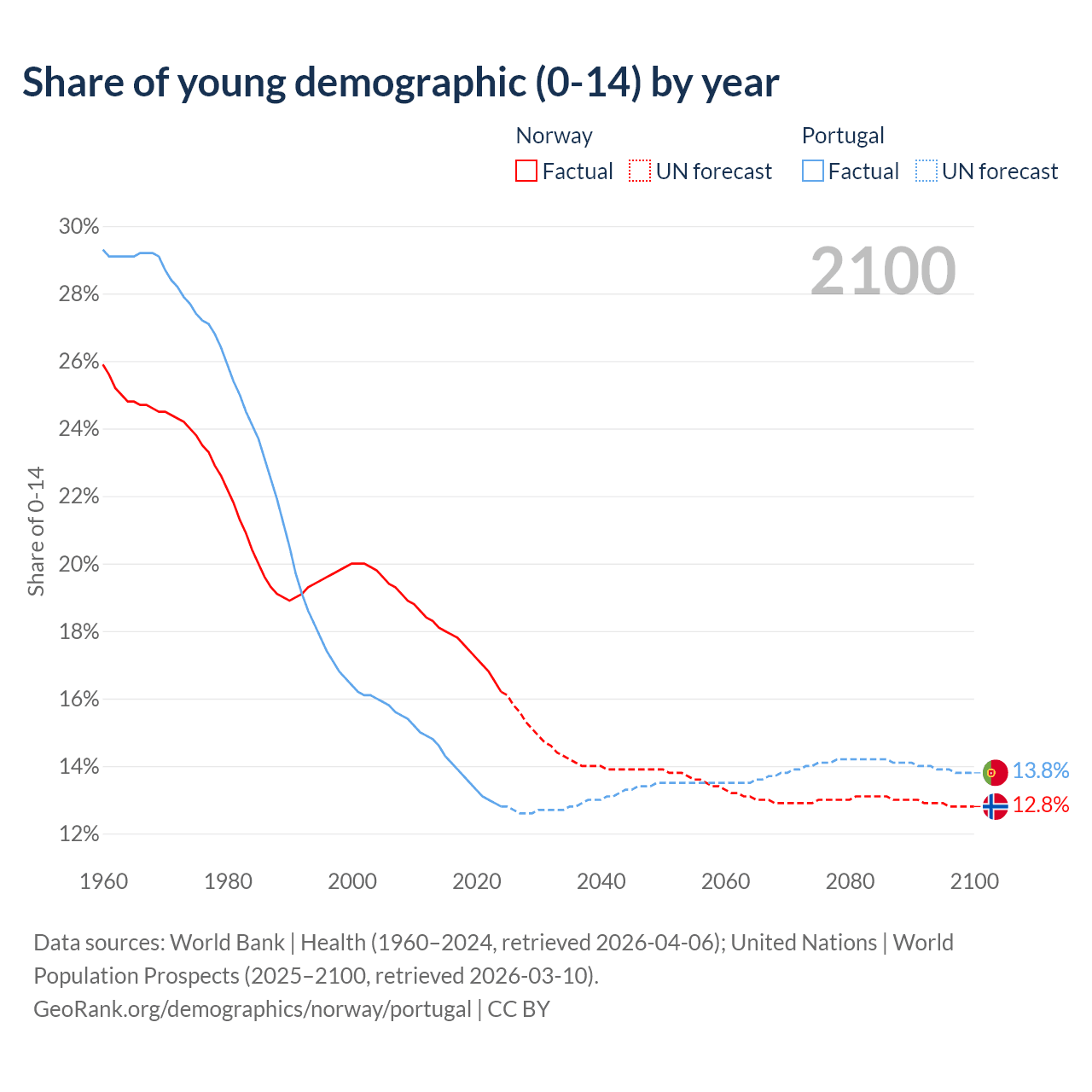 - The share of young demographic (0-15 years old) in Norway is 16.2% vs 12.8% in Portugal.