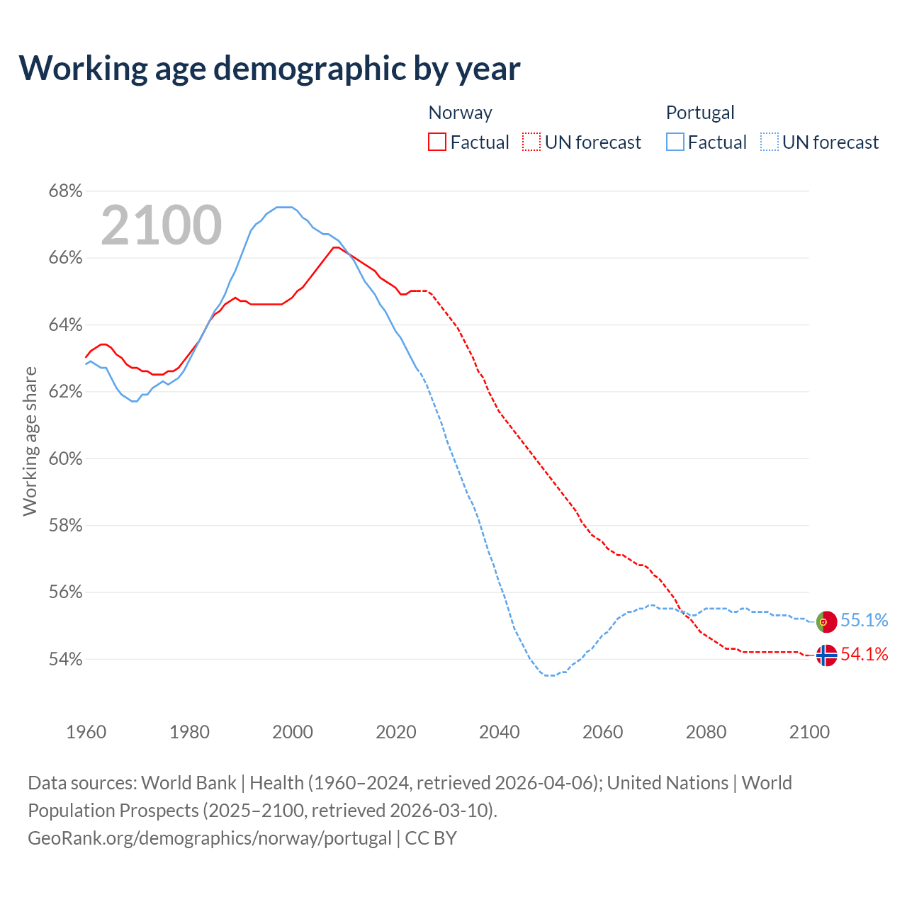- Norway has 3.69M working age adults (aged 15-64) vs 6.68M in Portugal.