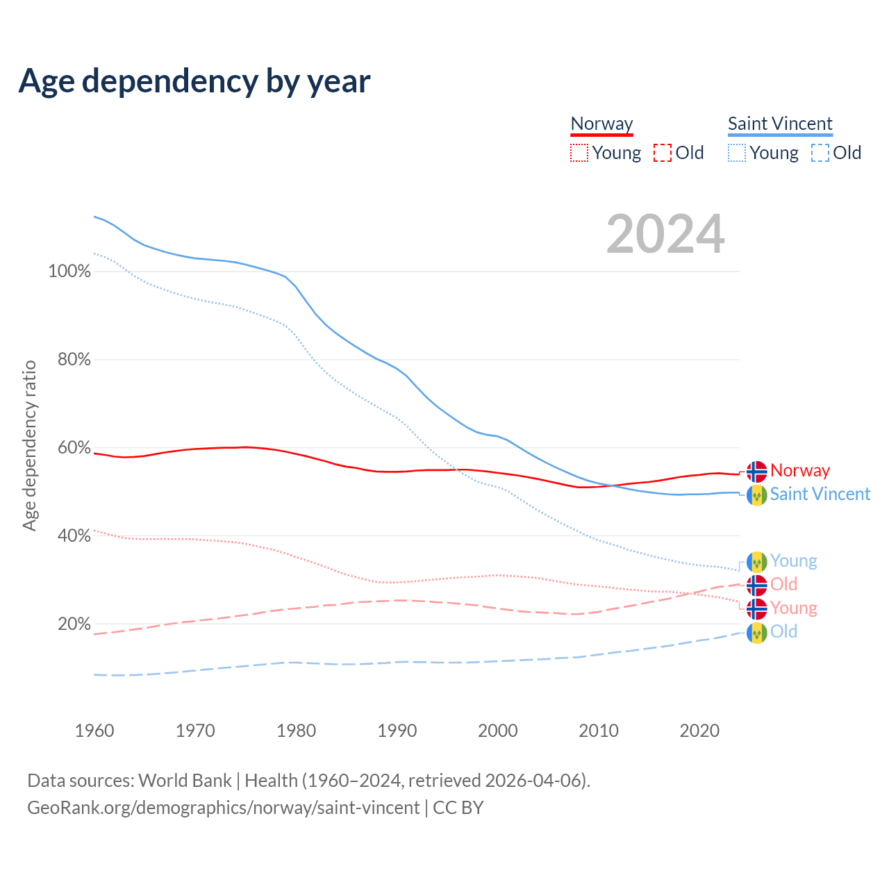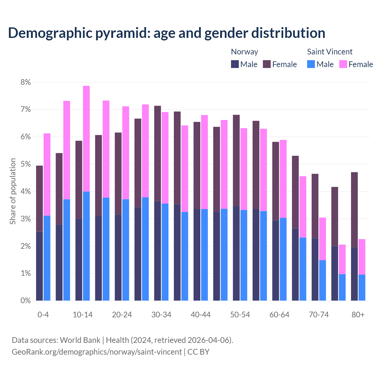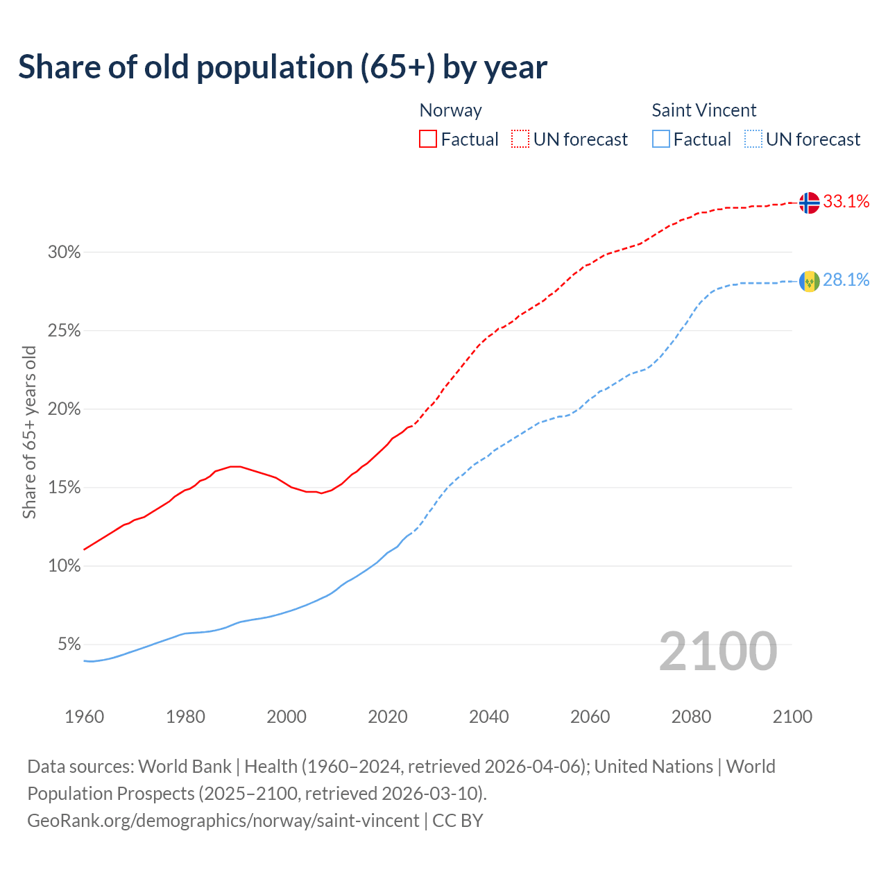 - The share of old-age demographic (65+) in Norway is 18.8% vs 11.9% in Saint Vincent.