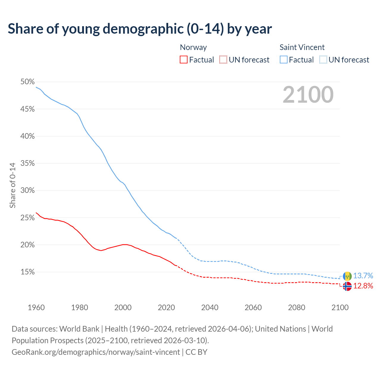 - The share of young demographic (0-15 years old) in Norway is 16.2% vs 21.3% in Saint Vincent.