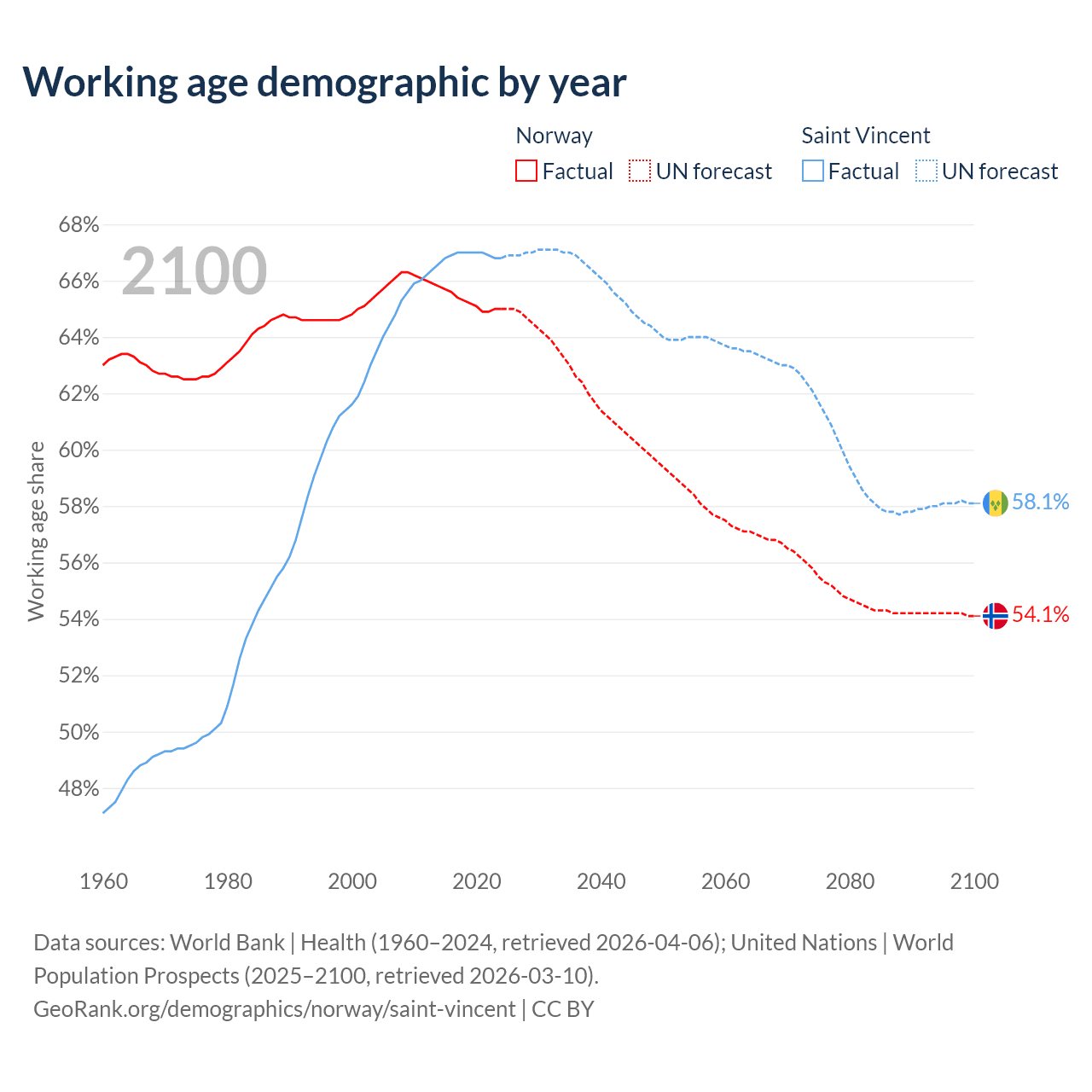 - Norway has 3.69M working age adults (aged 15-64) vs 66.3K in Saint Vincent.