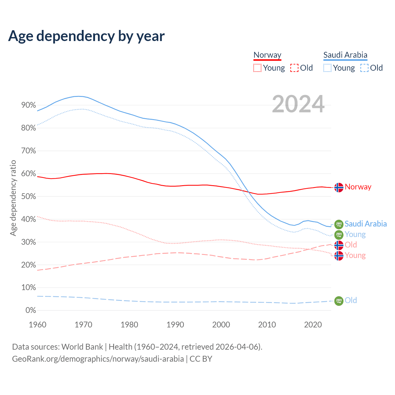 - Norway is ranked 43/196 by median age (oldest to youngest) vs 98/196 for Saudi Arabia.