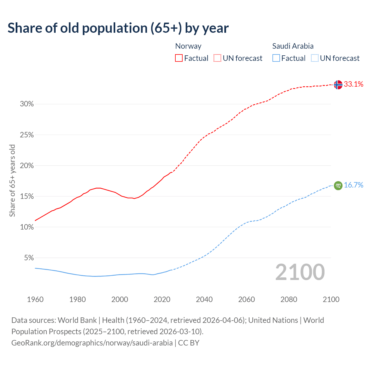 The share of older people aged 65 and over is 18.8% in Norway and 2.95% in Saudi Arabia. Life expectancy in Norway compared to Saudi Arabia .
