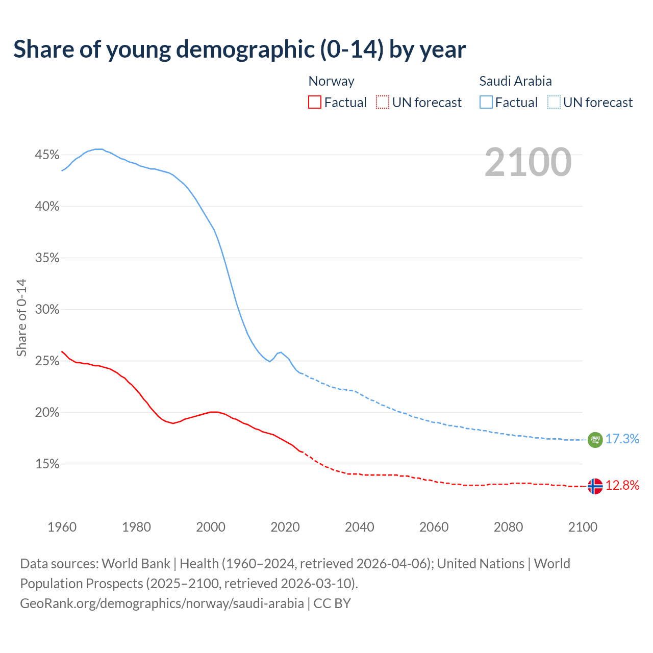 - The share of young demographic (0-15 years old) in Norway is 16.2% vs 23.8% in Saudi Arabia.