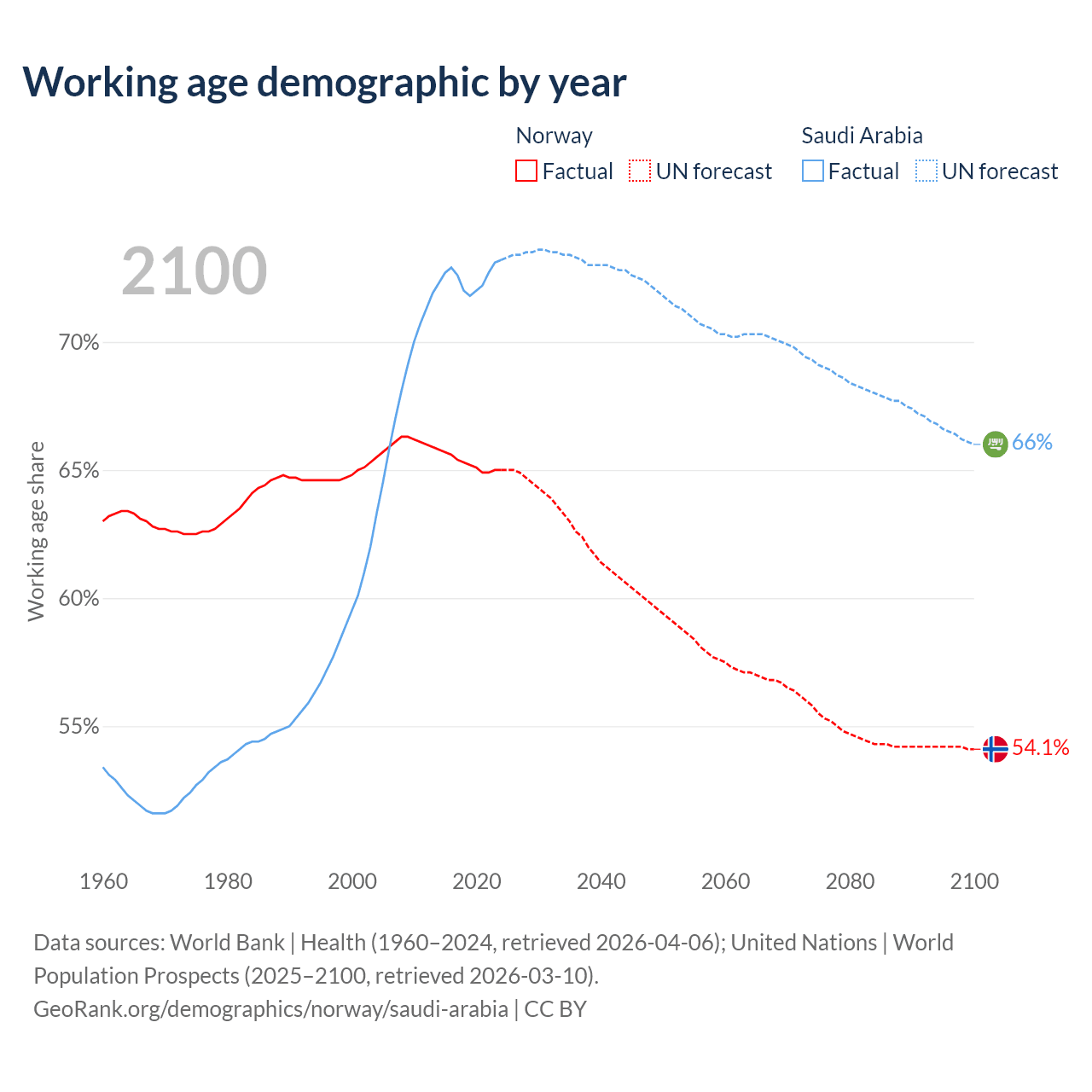 Median age Norway vs Saudi Arabia, 1960-2100