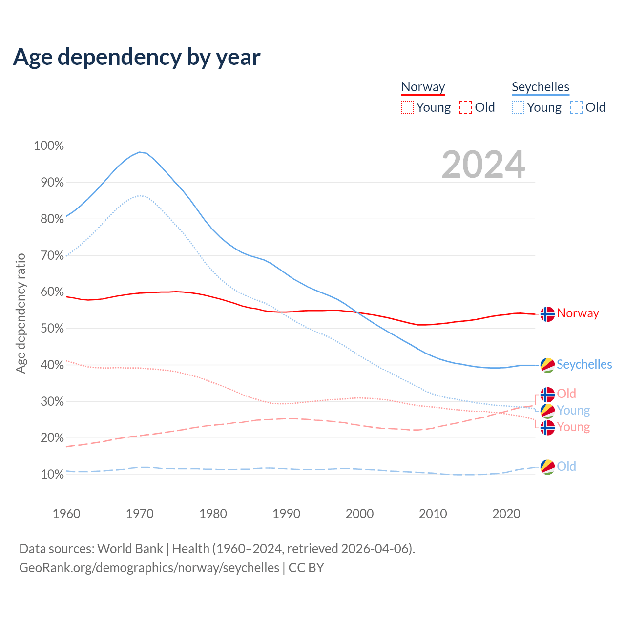 - Norway is ranked 43/196 by median age (oldest to youngest) vs 76/196 for the Seychelles.