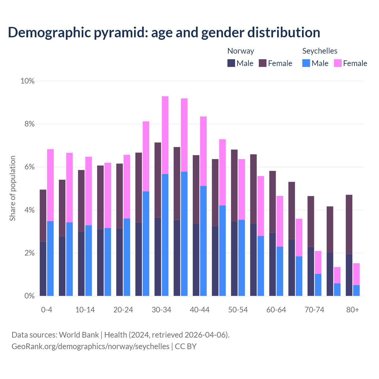 - As of 2026, the population of Norway is 5.67M vs 126K in the Seychelles - 44.9 times difference.